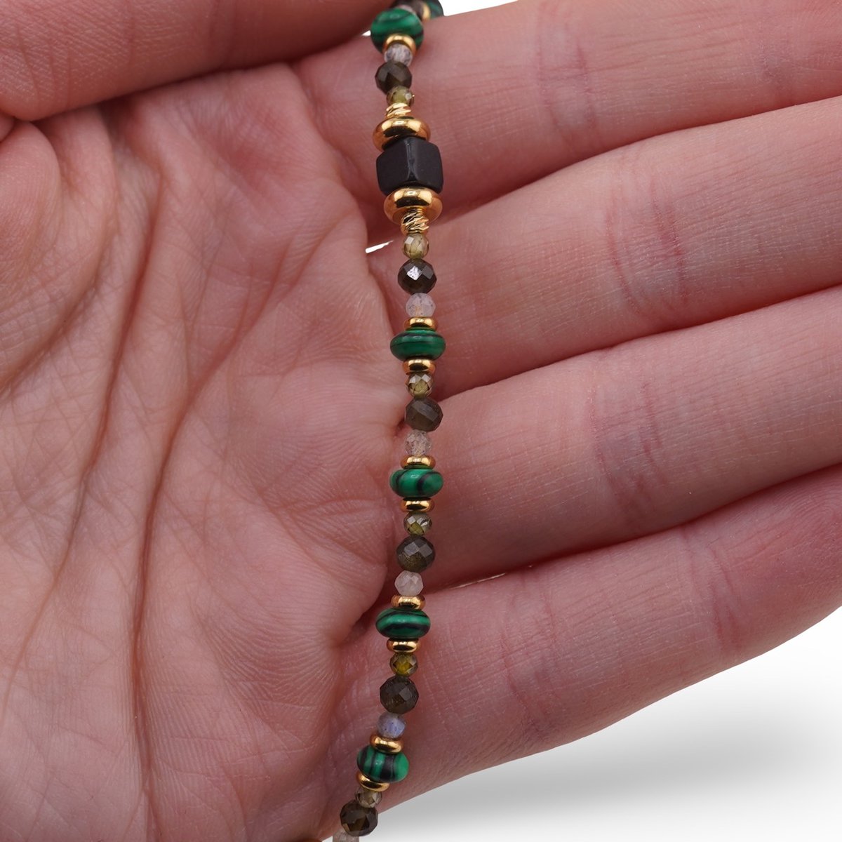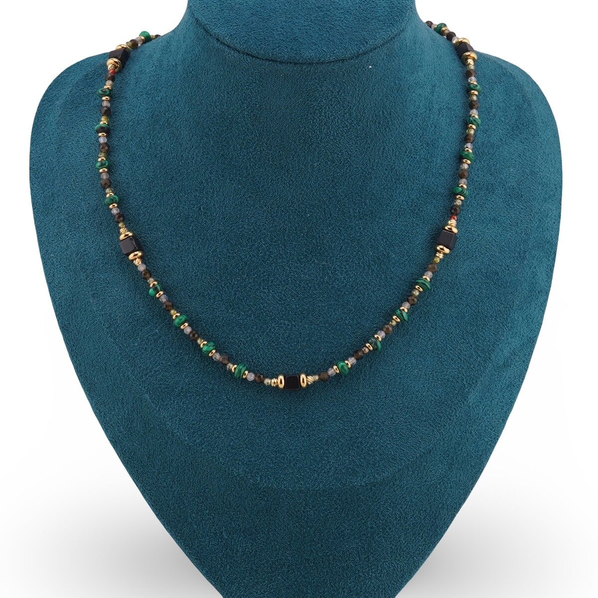 Acest colier cu malachit, cuart fumuriu și onix este creat pentru tine dacă îți dorești un accesoriu care să îmbine eleganța cu energia cristalelor naturale. Nuanțele de verde intens ale malachitului, reflexiile subtile ale cuartului fumuriu și negrul profund al onixului sunt puse în valoare de mici elemente aurii, care aduc un plus de strălucire discretă. Forma de rondele de 4–5 mm a malachitului, sferele fațetate de 3 mm de cuart fumuriu și cuburile de 4 mm de onix creează împreună un joc plăcut de volume și texturi, într-un colier de aproximativ 40 cm, ușor de purtat zi de zi.