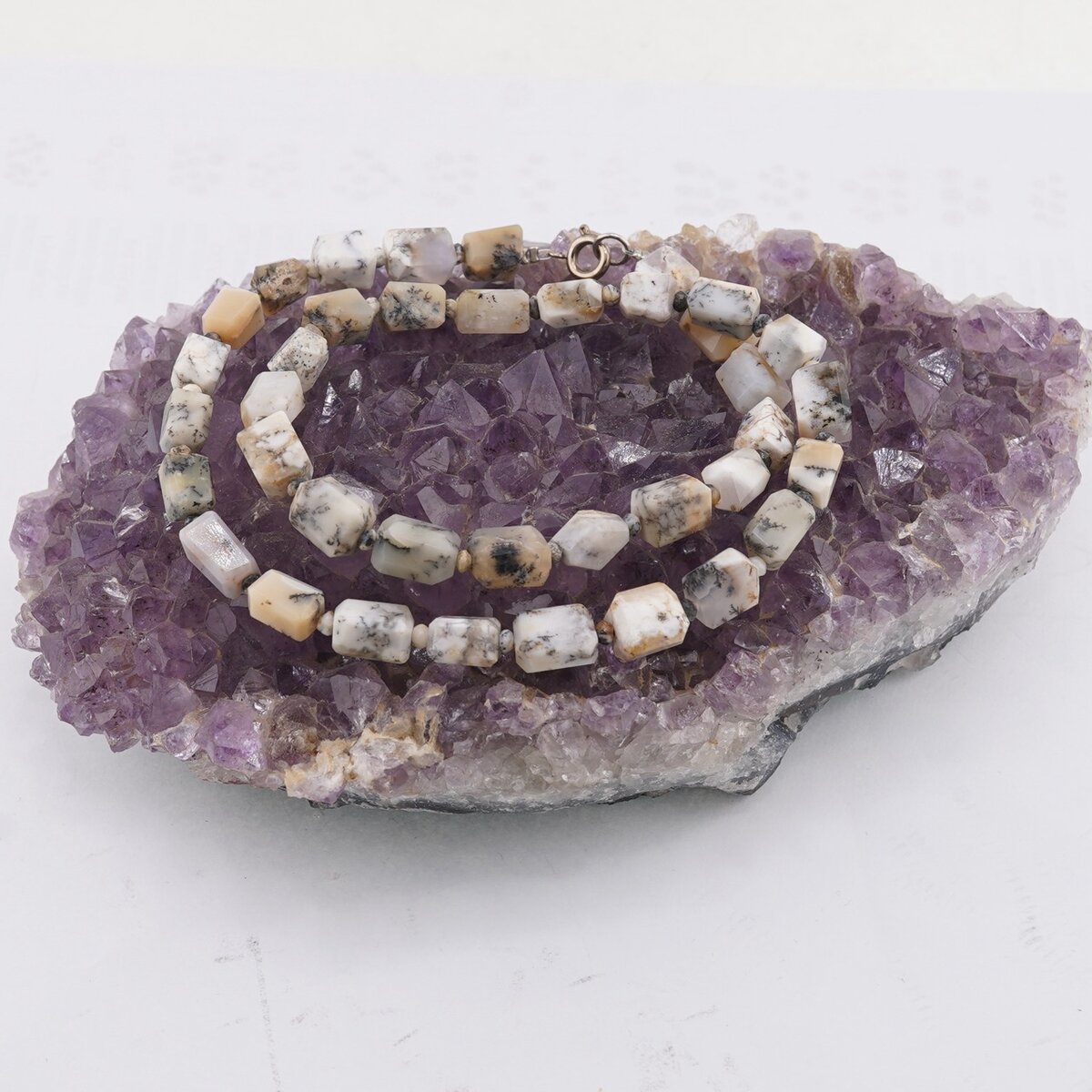 Acest colier din Opal dendritic îmbină naturalețea cu eleganța discretă, într-o piesă ușor de purtat zi de zi. Pietrele autentice, 100% cristal natural, surprind prin nuanțe de alb și gri, presărate cu desene organice specifice opalului dendritic. Alternanța dintre dreptunghiurile fațetate de 8–10 mm și discurile fațetate de 4 mm creează un ritm vizual echilibrat, iar fețele tăiate fin prind lumina cu un luciu plăcut, fără a fi stridente.
