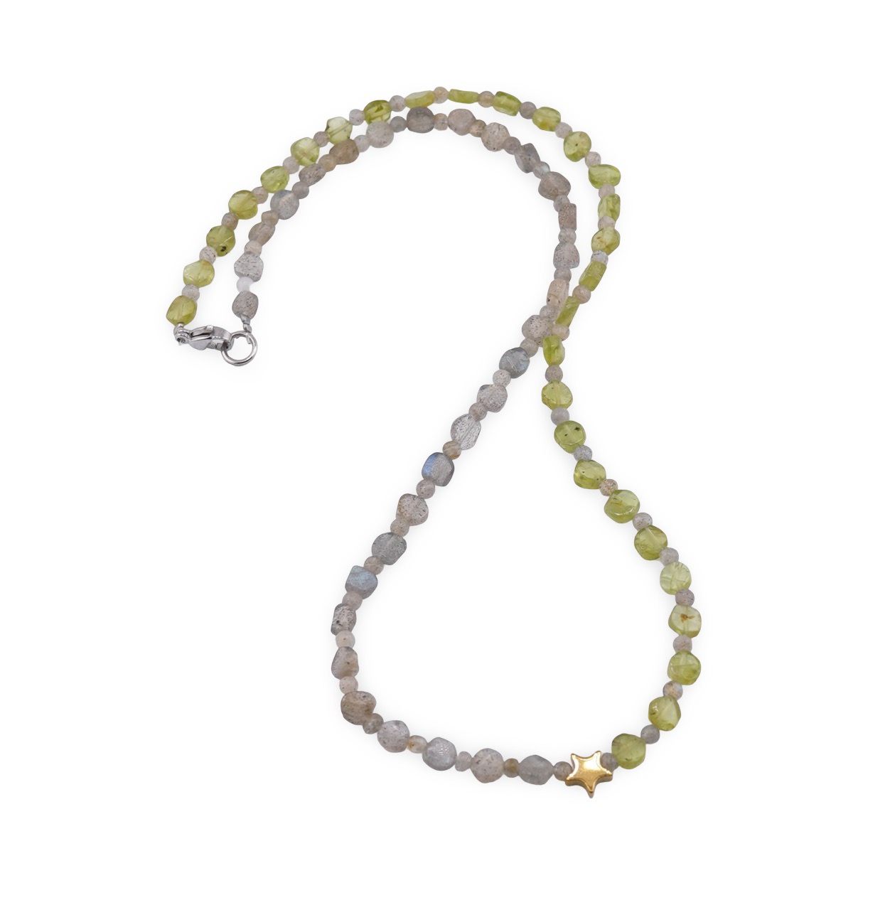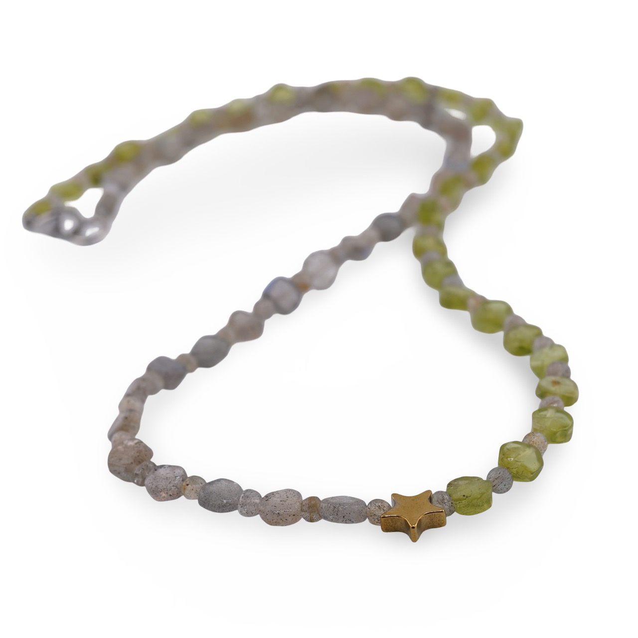 Un colier gândit pentru echilibru și inspirație, construit din cristale naturale 100%, atent tratate, în tonuri de verde și gri. Bănuții de Peridot se împletesc cu bănuții de Labradorit, iar mărgelele sferice de 3 mm leagă elegant compoziția. Accentuarea centrală din Hematit sub forma unei steluțe aurii completează designul discret, oferind un detaliu cald și modern. Lungimea de 43 cm îl face ușor de purtat zi de zi, fie la birou, fie în momentele tale de relaxare.