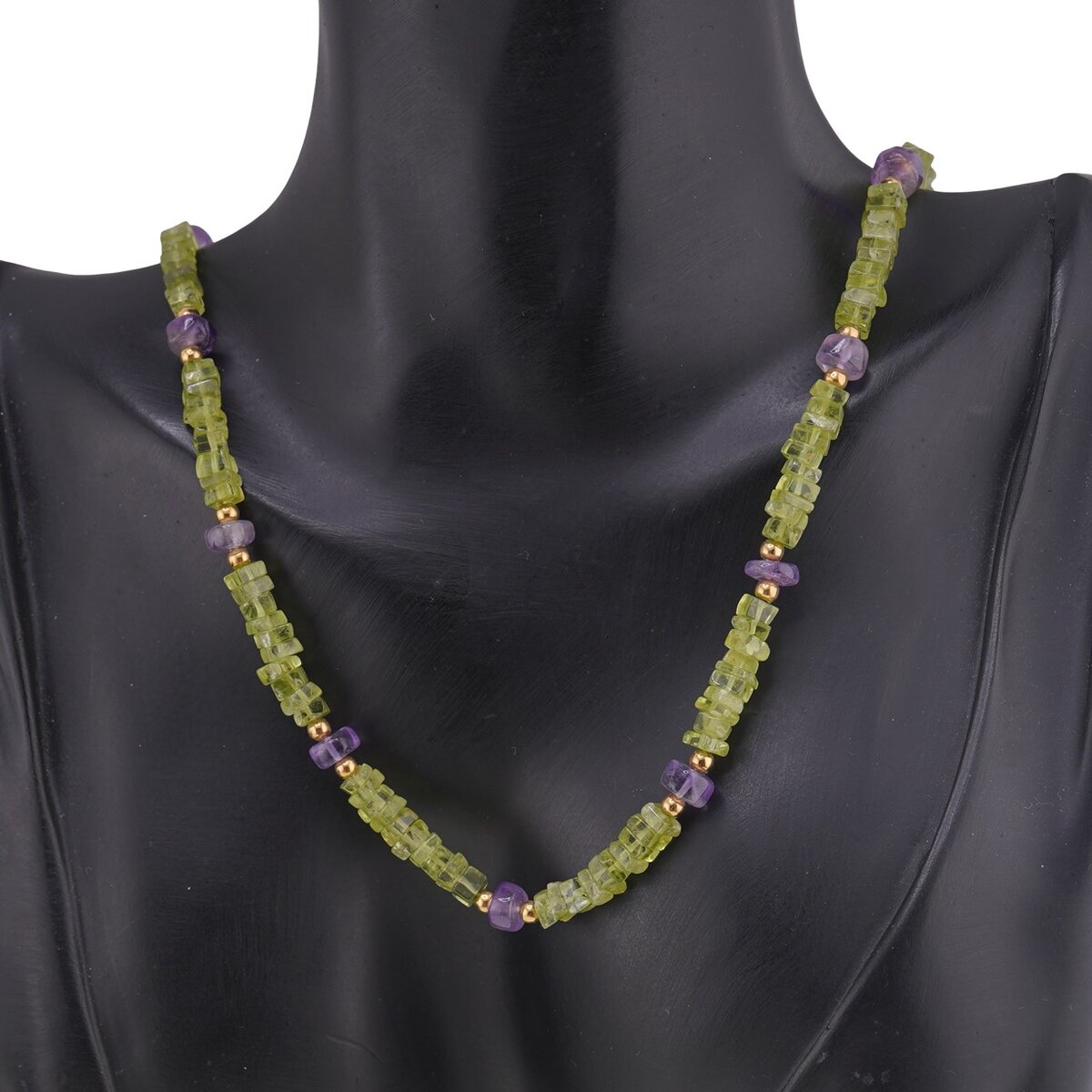 Colierul cu peridot pătrățele de 4 mm, ametist rondele de 6 mm și bumbi aurii este o alegere inspirată pentru tine dacă îți dorești un accesoriu delicat, cu cristale naturale, care să îmbine frumusețea culorilor cu beneficii pentru starea ta interioară. Nuanțele de verde intens ale peridotului și movul profund al ametistului se completează plăcut, iar accentele aurii dau colierului o notă caldă și modernă.