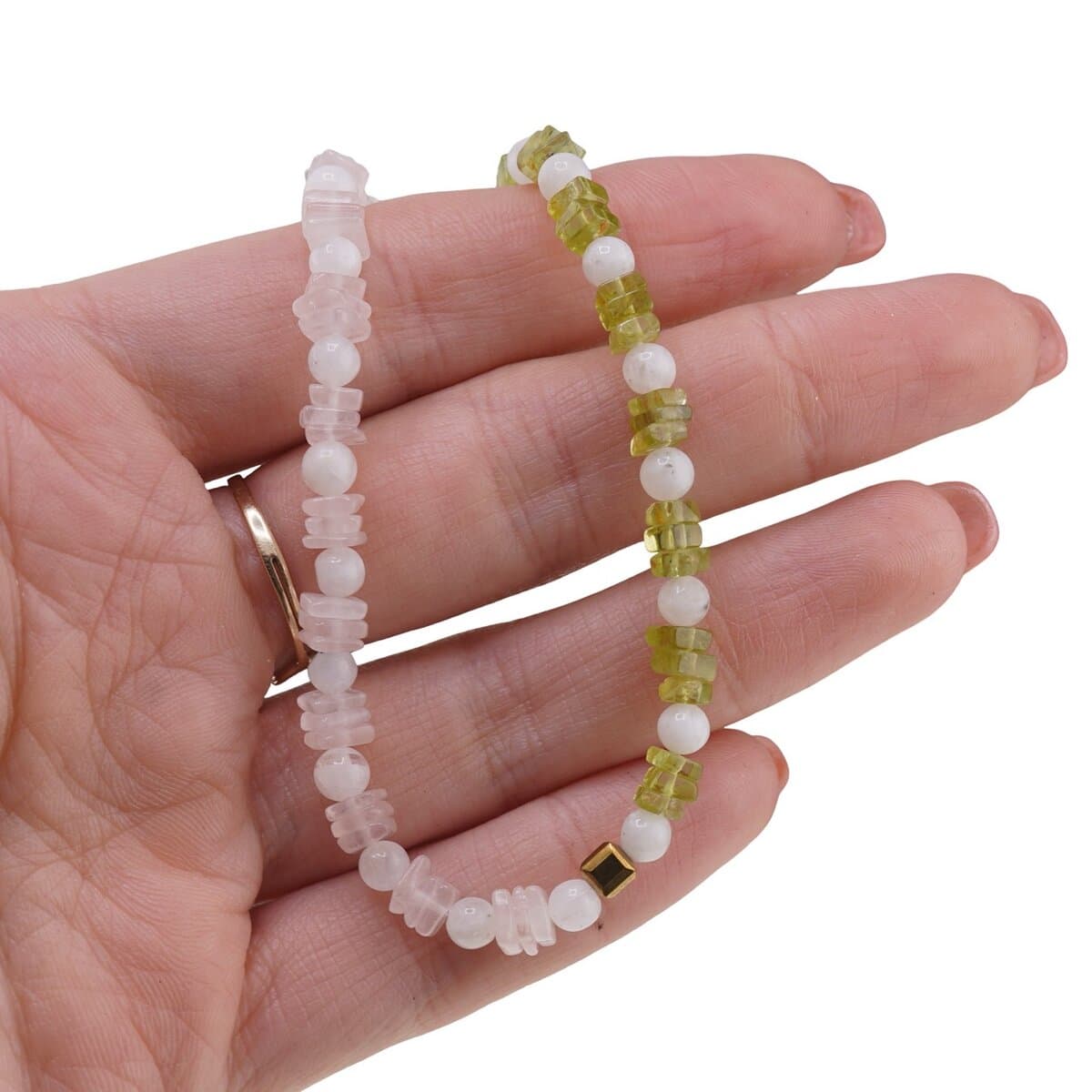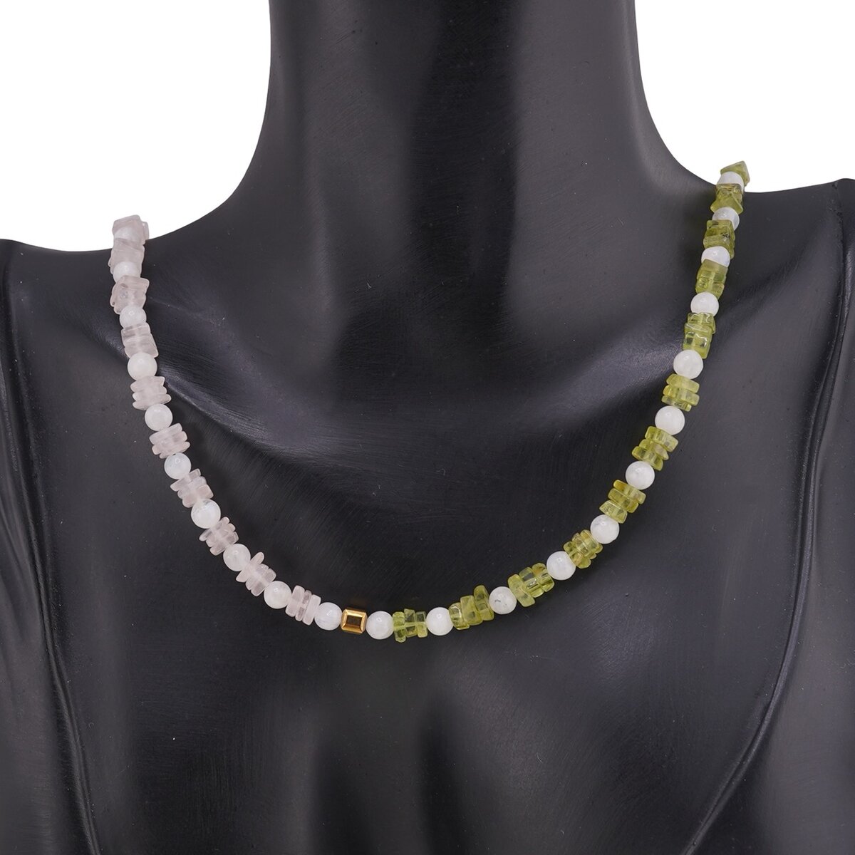 Colierul cu peridot, cuart roz, piatra lunii și hematit auriu este creat pentru tine dacă îți dorești mai multă claritate, stabilitate și bucurie în viața de zi cu zi. Contrastul dintre nuanțele de verde, roz pal și alb sidefat este pus în valoare de accentele aurii de hematit, oferind un accesoriu discret, dar vizibil, ușor de integrat atât în ținutele casual, cât și în cele elegante.
