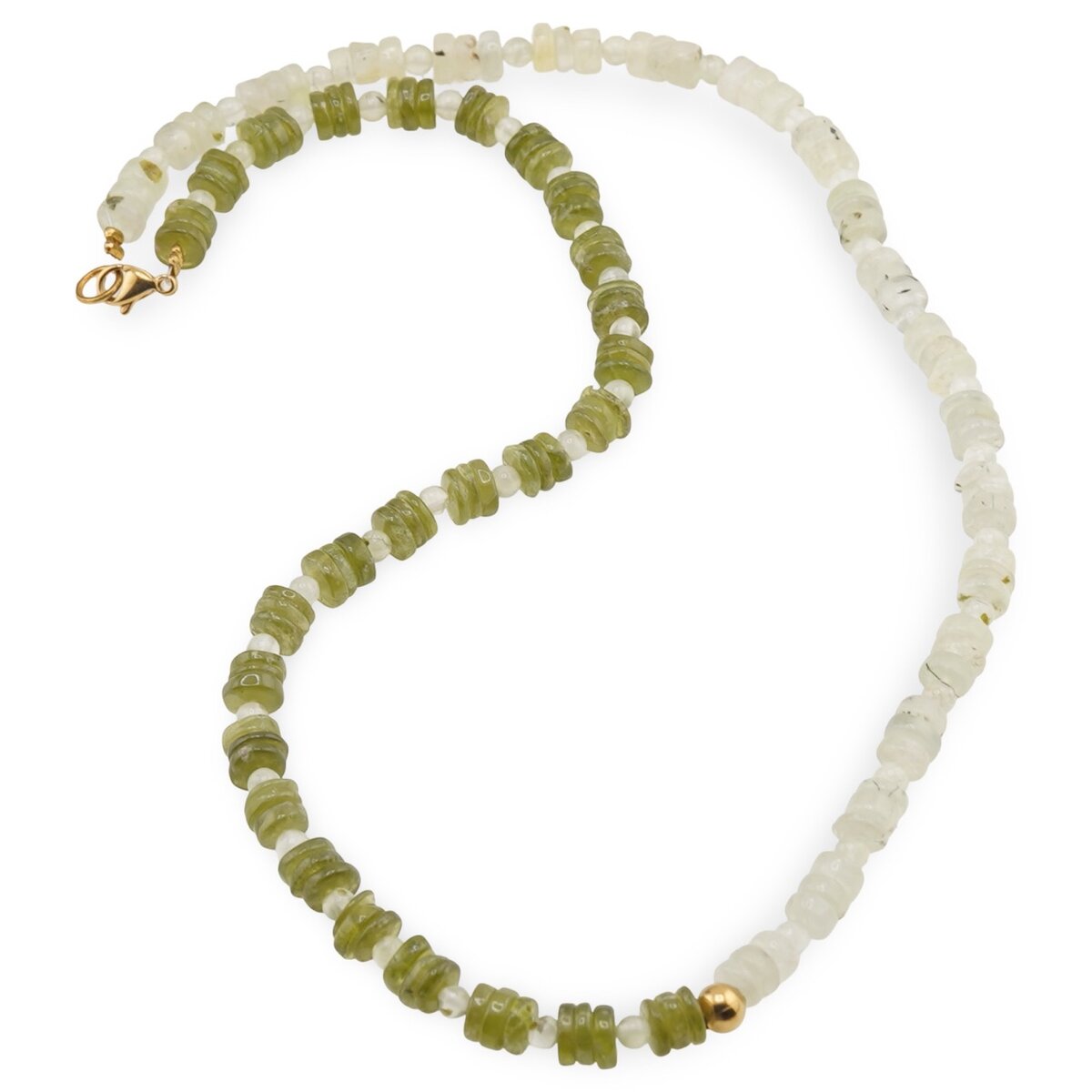Colier Peridot si Prehnit rondele 6mm, Prehnit sfere 4mm si Hematit auriu