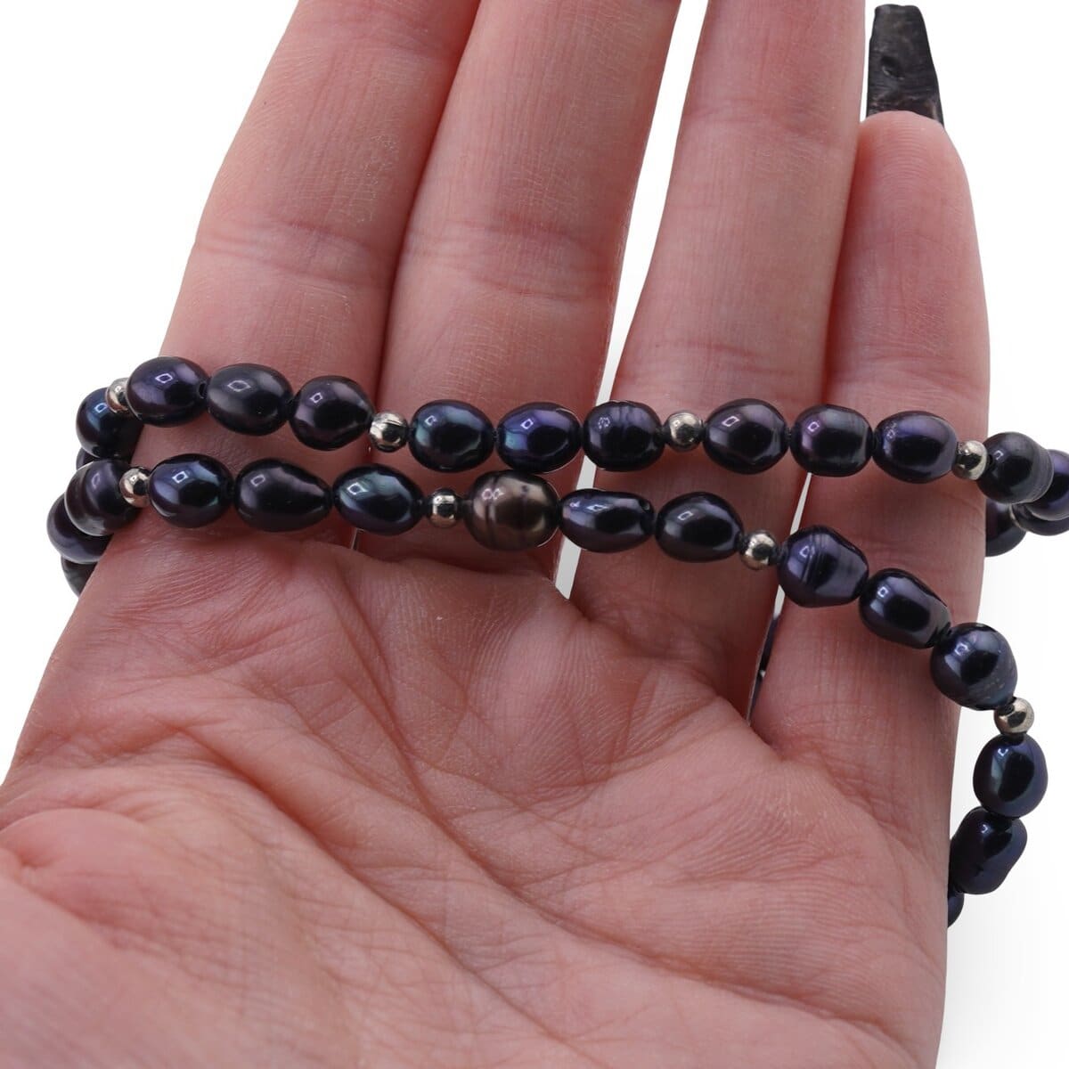 Gândit pentru momentele în care ai nevoie de calm și claritate, acest colier cu perle de cultură albastre aduce o notă curată și rafinată în ținutele de zi sau de seară. Perlele lunguiete, cu diametru de aproximativ 6–7 mm, au o nuanță de albastru obținută prin vopsire pe perlă naturală, păstrând farmecul organic al materialului. Lungimea de 43 cm se așază ușor la baza gâtului, iar elementele argintii completează discret luciul delicat al perlelor.