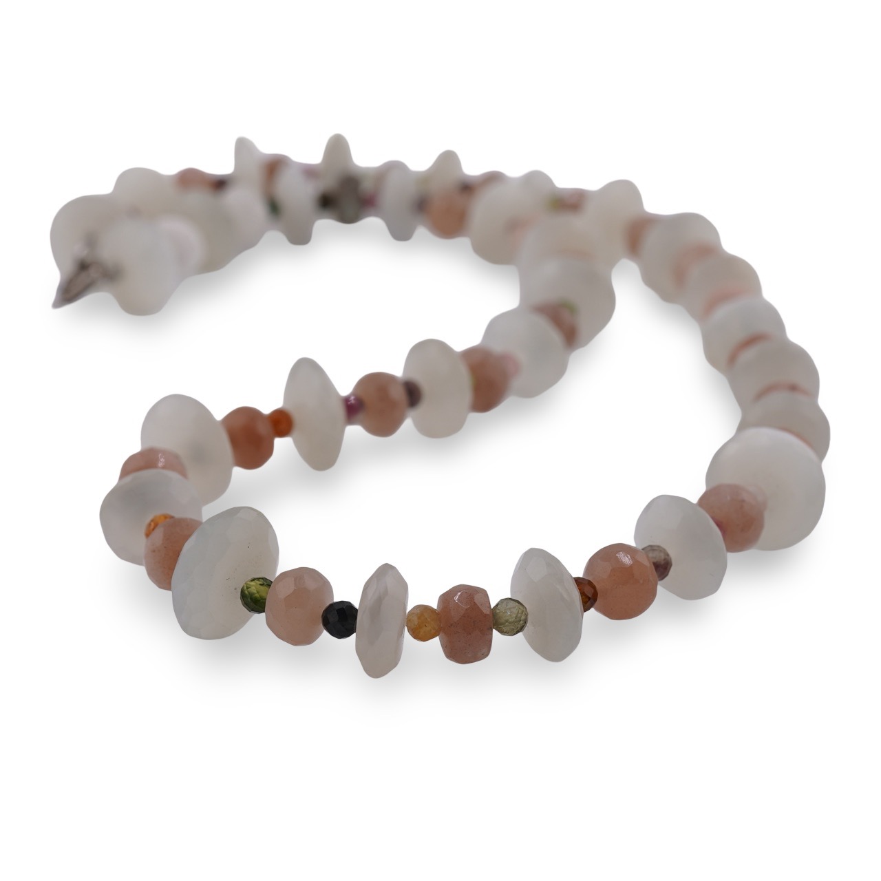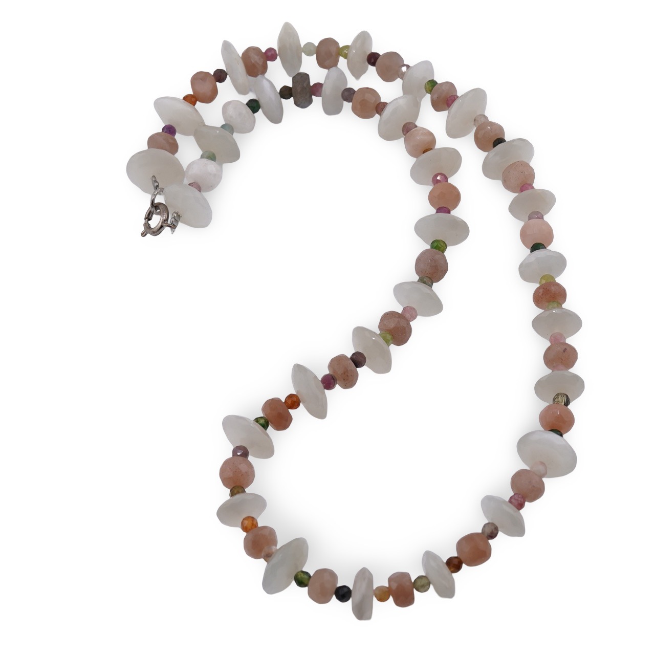 Colier Piatra lunii discuri fațetate 12mm, Piatra lunii piersică discuri fațetate 6mm și Turmalină multicoloră sfere fațetate 3mm