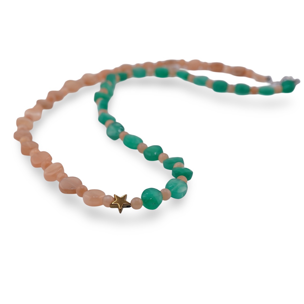 Alege un colier din cristale naturale 100% care îmbină portocaliul cald al Pierrii Lunii piersică cu verdele intens al Onixului verde, accentuate discret de o stelută din Hematit auriu. Designul alternează mărgele tip bănuți cu sfere fine, pentru un aspect armonios și ușor de purtat în fiecare zi.