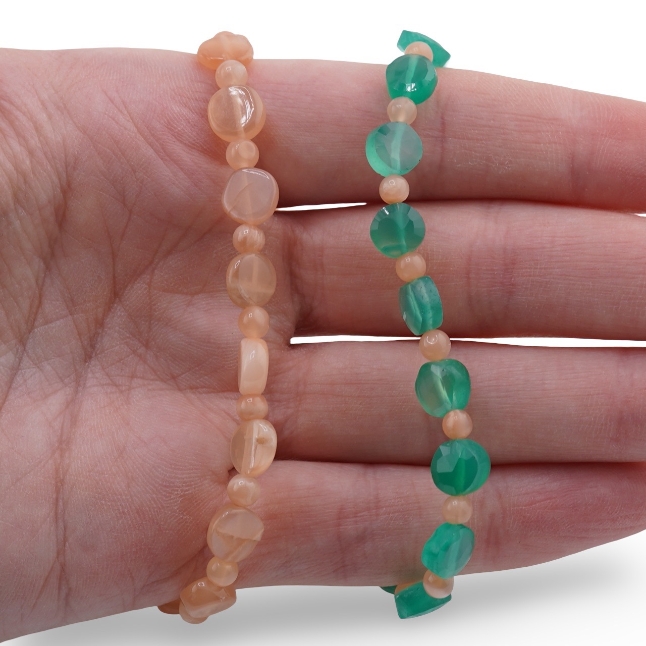 Cunoscută ca Piatra intuiției (Moonstone, feldspat ortoclazic), Piatra Lunii aduce claritate și echilibru emoțional și este asociată cu energia Lunii și elementul Apă. Mulți o poartă pentru a-și asculta mai bine vocea interioară și pentru a cultiva sensibilitatea creativă, cu o vibrație ce susține Ajna (chakra frunții) și Svadhisthana (chakra sacrală). Onixul verde, o varietate de calcedonie stratificată, este frecvent ales pentru curaj, voință și protecție energetică, oferind împământare și stabilitate în ritmul cotidian; simbolic, este conectat la Saturn și la elementul Pământ, lucrând cu Muladhara (chakra rădăcinii). Inserția de Hematit auriu adaugă un accent luminos și susține o prezență calmă și centrată.