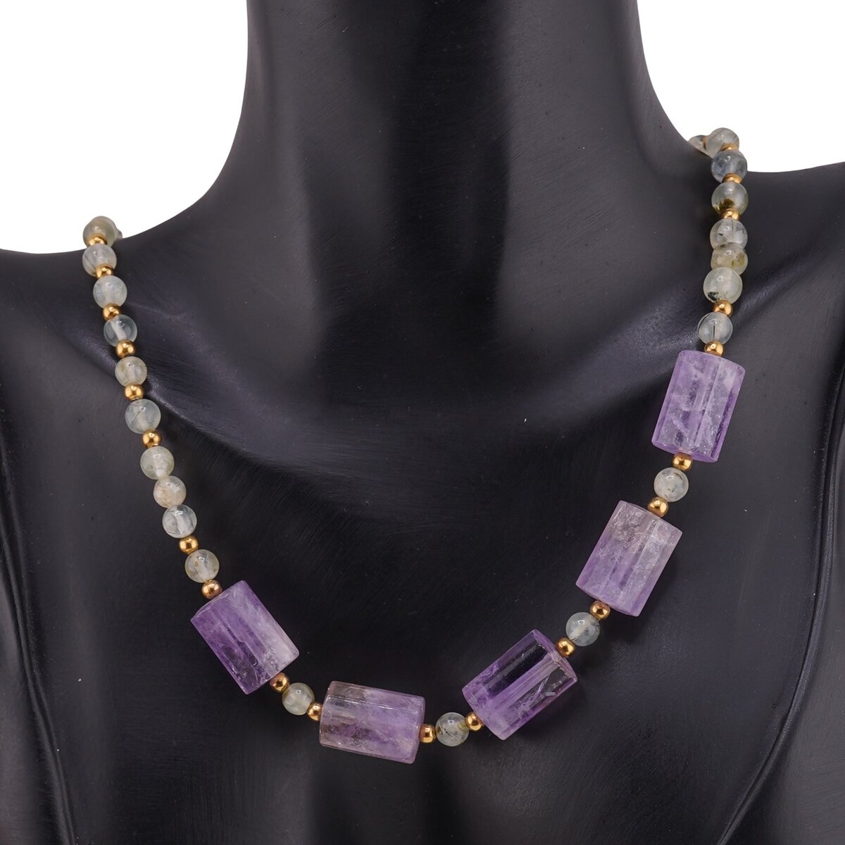 Colier Prehnit sfera 5mm si Ametist tuburi fatetate 14mm, elemente aurii, Sistem de inchidere: Inchizatoare metal rodiat Colier Prehnit sfera 5mm si Ametist tuburi fatetate 14mm, elemente aurii, Sistem de inchidere: Inchizatoare argint 925