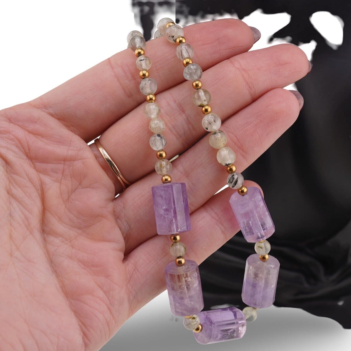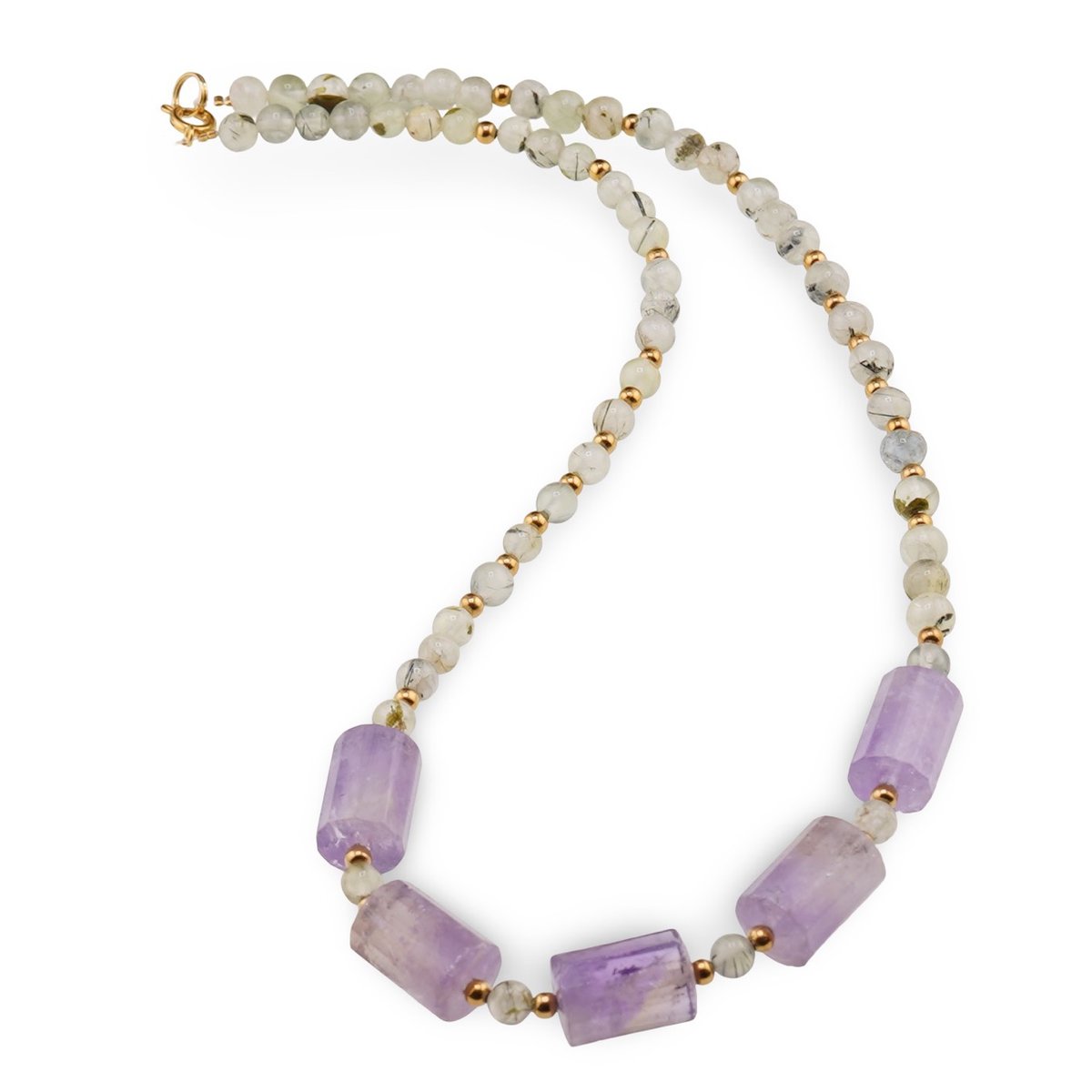Colier Prehnit sfera 5mm si Ametist tuburi fatetate 14mm, elemente aurii