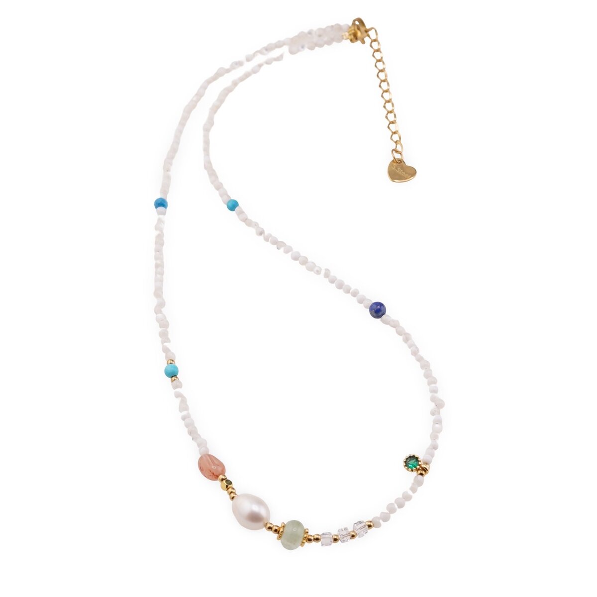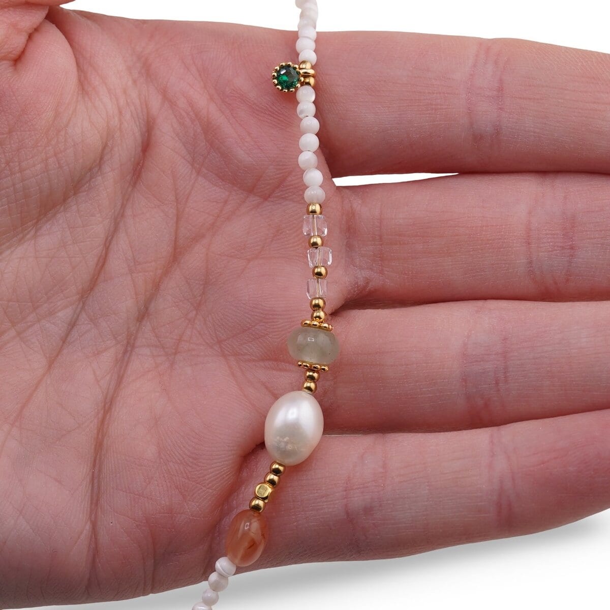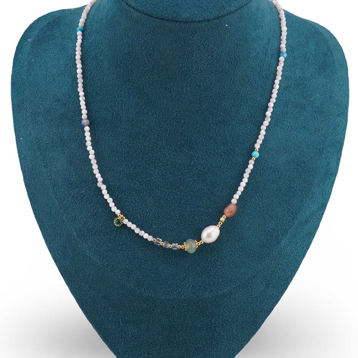 Colierul din sidef alb cu sfere de 3 mm, elemente aurii si un rafinat mix de cristale este o alegere potrivită pentru tine dacă îți dorești un accesoriu discret, dar plin de semnificație. Sideful, cunoscut și sub numele de Mother of Pearl sau „piatra liniștii”, este stratul de carbonat de calciu din interiorul scoicilor, apreciat pentru luciul lui delicat și nuanțele calde de alb.