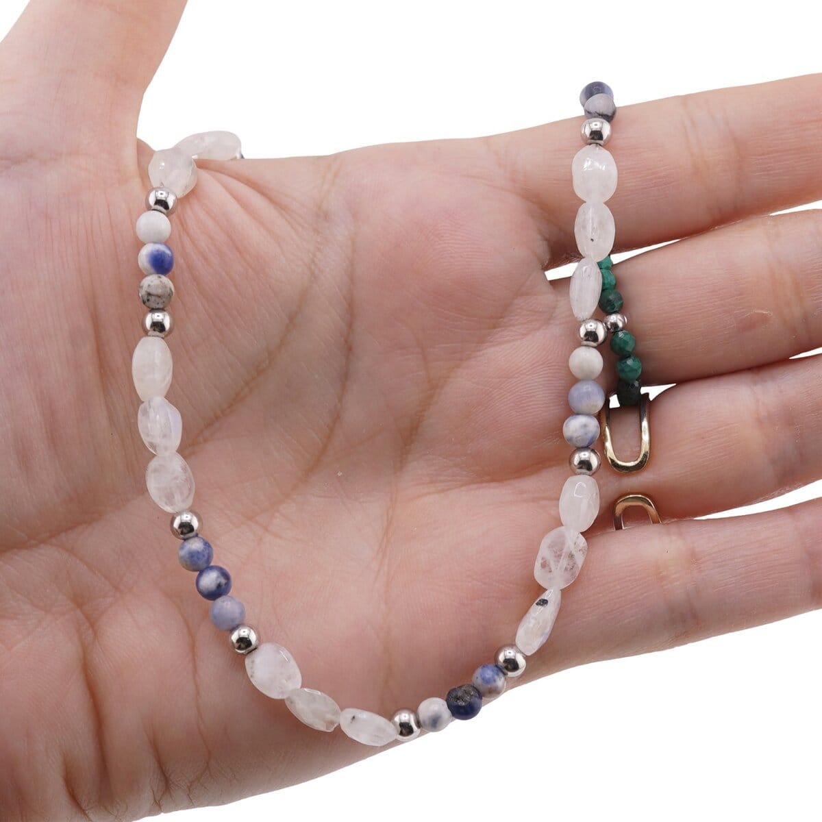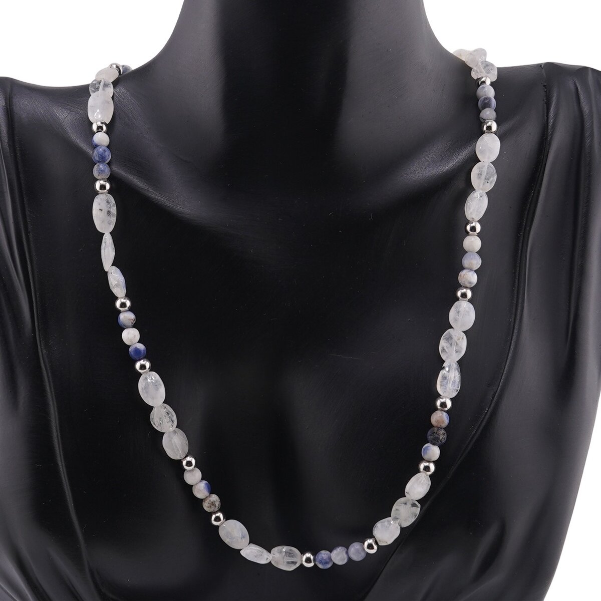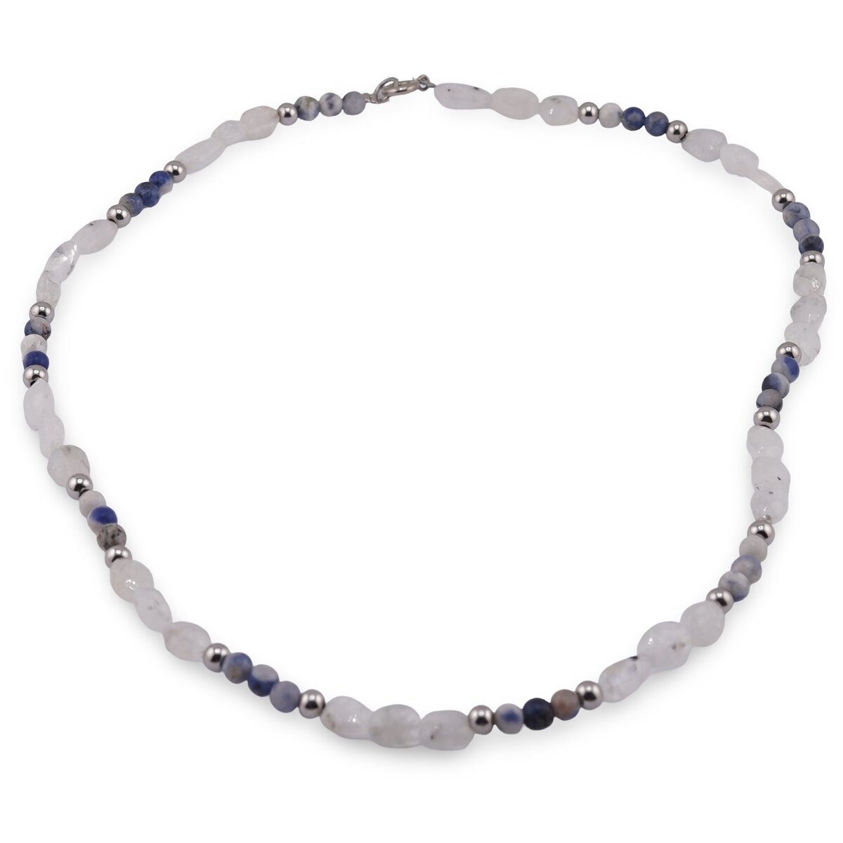 Colier Sodalit sfere 4mm si Piatra Lunii neuniforma fatetata 6-10mm cu bumbi argintii