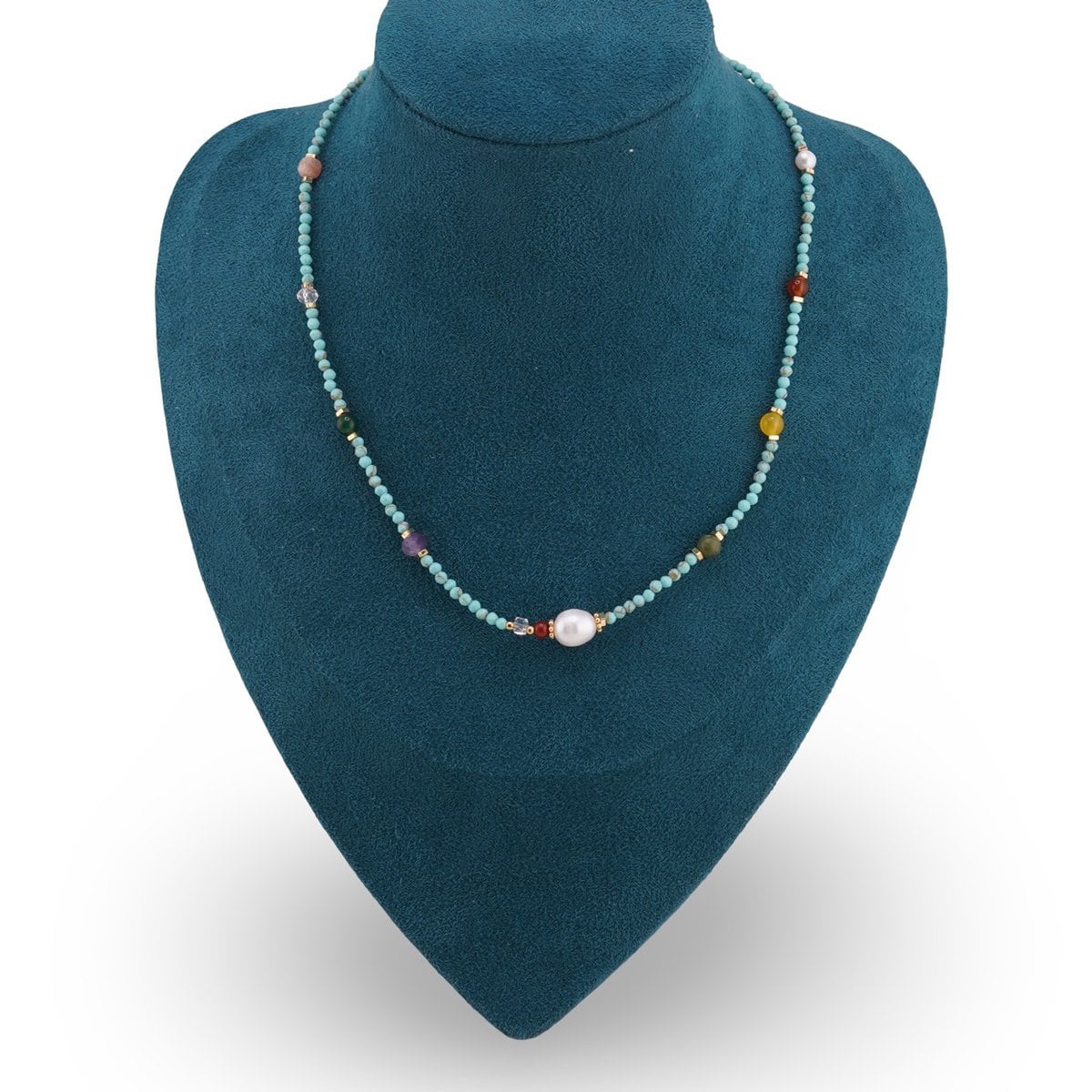 Acest colier cu turcoaz fațetat, perle de cultură și cristale de 4 mm este creat pentru tine dacă îți dorești un accesoriu delicat, cu o energie calmă și echilibrată. Nuanțele de albastru ale turcoazului se îmbină cu strălucirea discretă a elementelor aurii și cu eleganța perlelor, formând o bijuterie ușor de purtat în fiecare zi. Forma ușor neuniformă a pietrelor, alături de sferele și sferele fațetate, oferă colierului un aspect natural și plăcut.