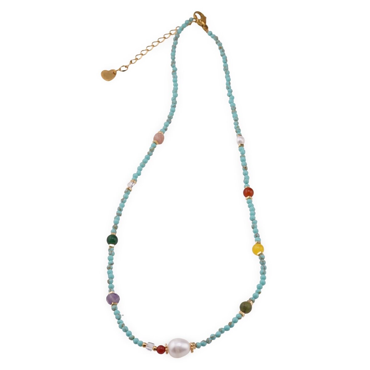 Colier Turcoaz fațetat 3mm, Perle de cultură, mix de cristale 4mm și elemente aurii