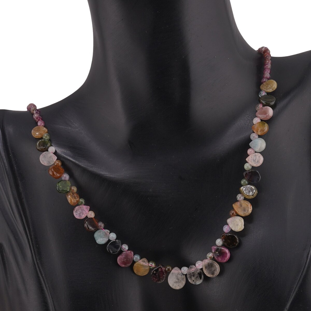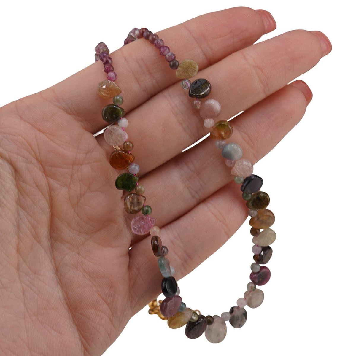 Acest colier din turmalină multicoloră este creat pentru tine dacă îți dorești un accesoriu fin, dar încărcat de semnificație. Sferele mici de aproximativ 3 mm alternează cu brioletele de 7 mm, formând un șir de cristale naturale care aduc împreună nuanțe calde și reci, de la tonuri închise, protectoare, până la accente blânde, asociate cu inima și energia iubirii.