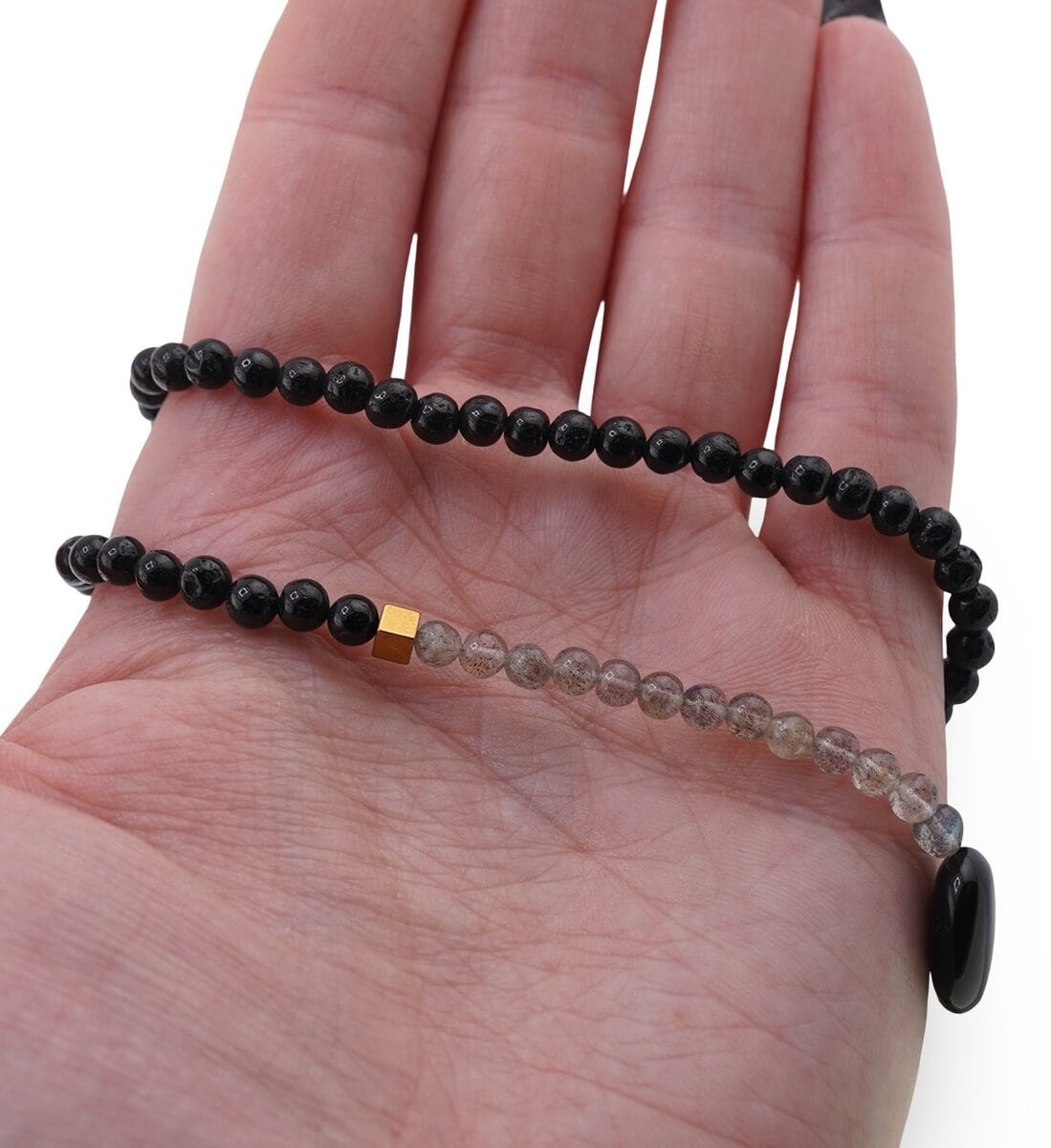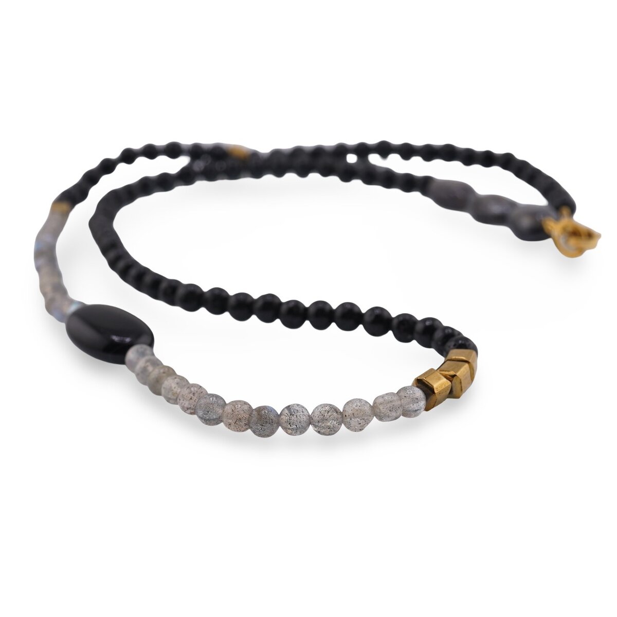 Realizat din cristal natural 100%, finisat și tratat pentru un aspect armonios, colierul îmbină rezistența și confortul, cu o duritate totală a pietrelor cuprinsă între aproximativ 5,5 și 7,5 pe scara Mohs. Este o alegere inspirată când vrei protecție energetică, împământare și stabilitate, energie și vitalitate, dar și curaj și voință în proiectele tale. Turmalina și labradoritul susțin claritatea mentală și intuiția, iolitul încurajează viziunea interioară, iar onixul și hematitul pot ancora intențiile tale, ajutându-te să te focusezi pe creativitate, inspirație și abundență financiară.