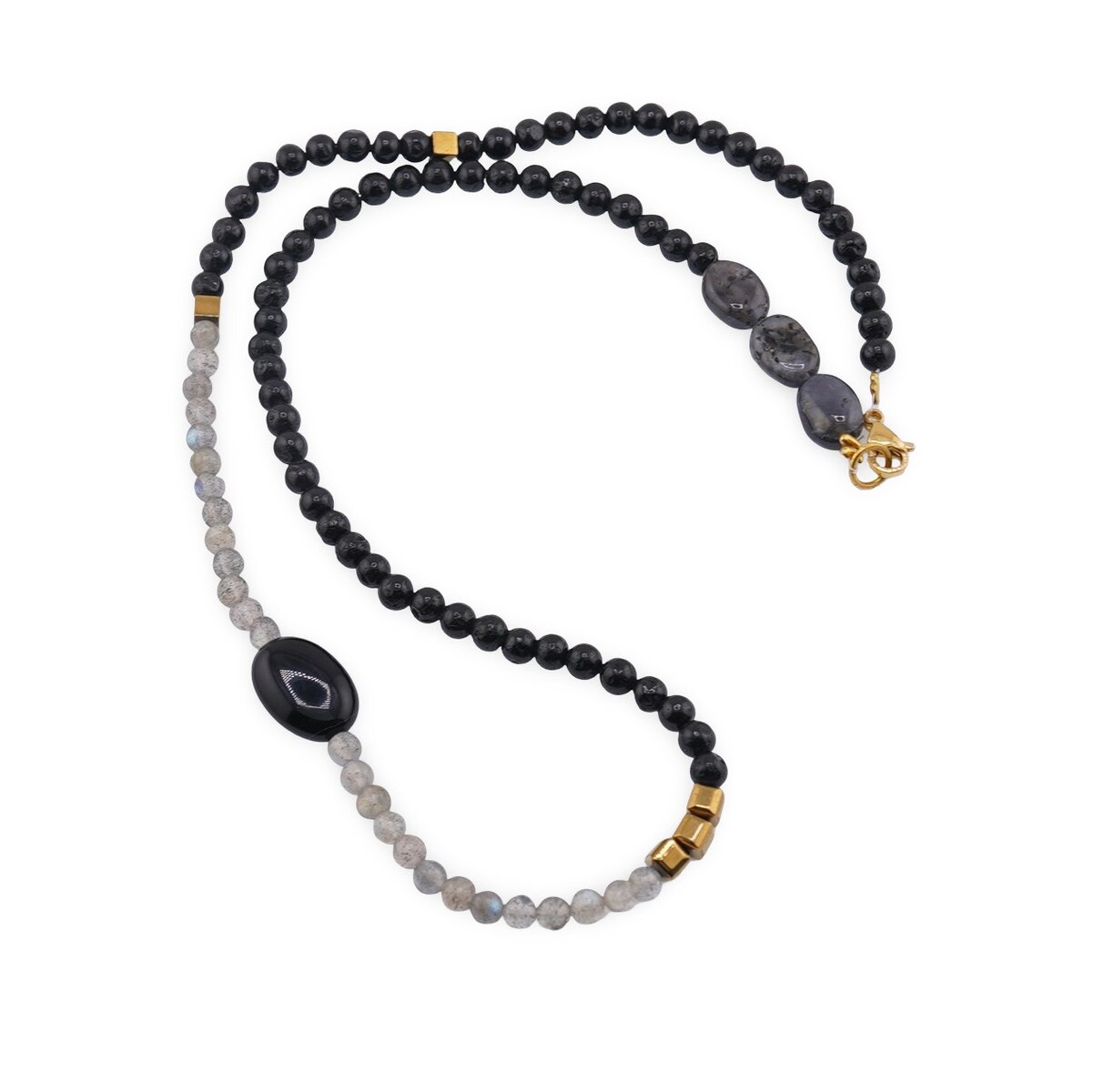 Colier Turmalina si Labradorit sfere 4mm, Hematit auriu cuburi 4mm, Iolith neuniform 10mm, Onix neuniform 14mm