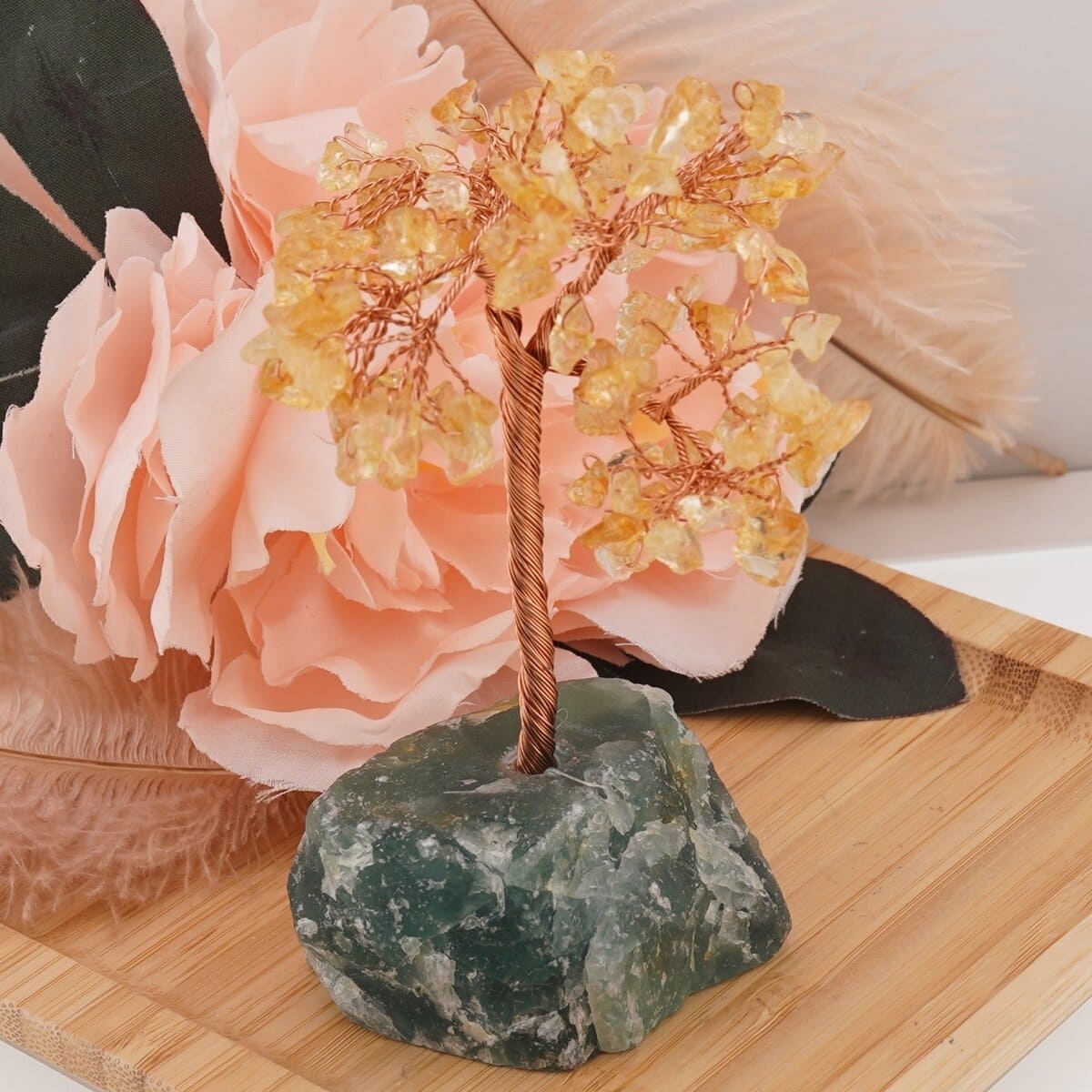 Ramurile realizate din sârmă de cupru poartă chipsuri de citrin natural, cunoscut și ca cuart galben sau „piatra succesului”. Citrinul este adesea ales de cei care își doresc mai multă abundență financiară, prosperitate și energie pentru proiectele lor. Poate susține creativitatea, inspirația și vitalitatea, fiind un sprijin bun atunci când vrei să îți pui în ordine ideile și să acționezi cu încredere. Este asociat cu chakra plexului solar, zona responsabilă de putere personală și curaj.