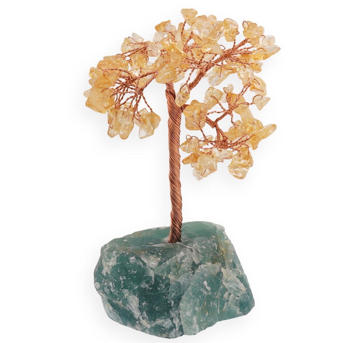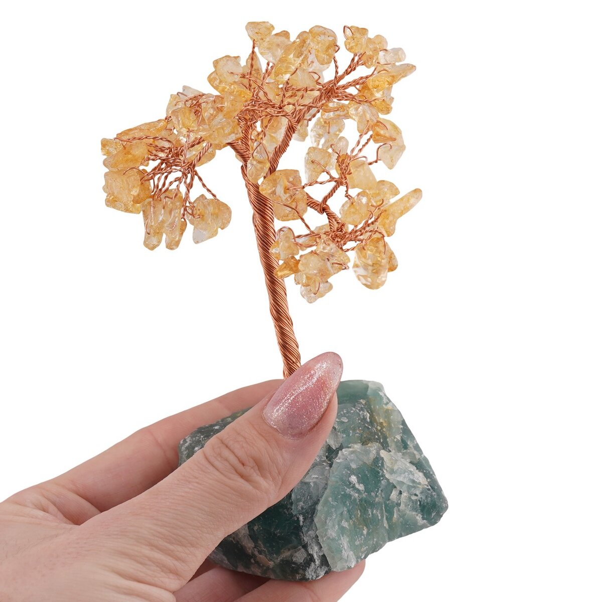 Baza copacului este din fluorit natural, cunoscut ca „piatra intelectului”, cu nuanțe de verde care aduc o notă de calm și echilibru. Fluoritul este apreciat pentru susținerea concentrării, a clarității mentale și a protecției energetice, fiind util atunci când studiezi, lucrezi intens sau treci prin perioade cu multe decizii. Este conectat cu chakra frunții și chakra coroanei, zone asociate intuiției și conexiunii cu planul mental superior.