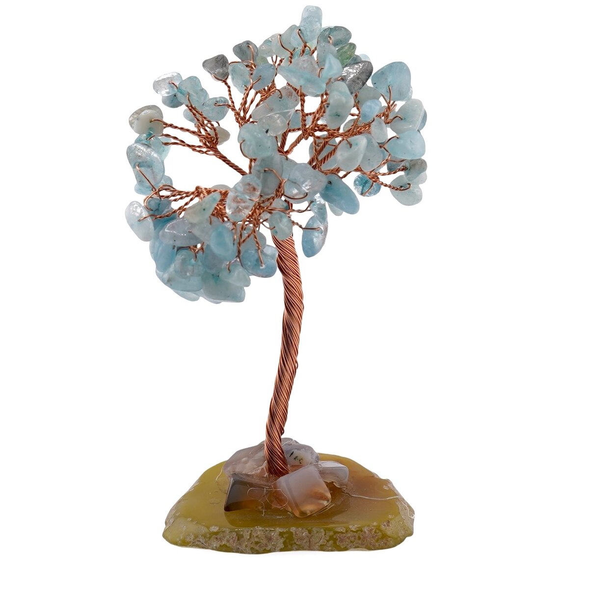Copacul decorativ cu Acvamarin și bază din Agat natural este gândit pentru tine dacă îți dorești mai mult calm, claritate și siguranță interioară în spațiul în care trăiești sau lucrezi. Ramurile din sârmă de cupru susțin cristale de acvamarin de un albastru blând, iar trunchiul se sprijină pe o bază solidă de agat natural în nuanțe de maro și tonuri pământii, care aduc stabilitate și ancorare.