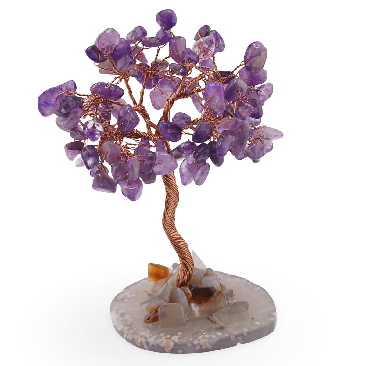Copacul decorativ cu Ametist și bază din Agat natural este creat pentru tine dacă îți dorești un colț de liniște și echilibru în spațiul în care petreci cel mai mult timp. Crenguțele din cupru, atent modelate, susțin mici fragmente de cristal natural de ametist, într-o nuanță plăcută de mov, armonizate cu tonurile calde de maro ale bazei de agat.