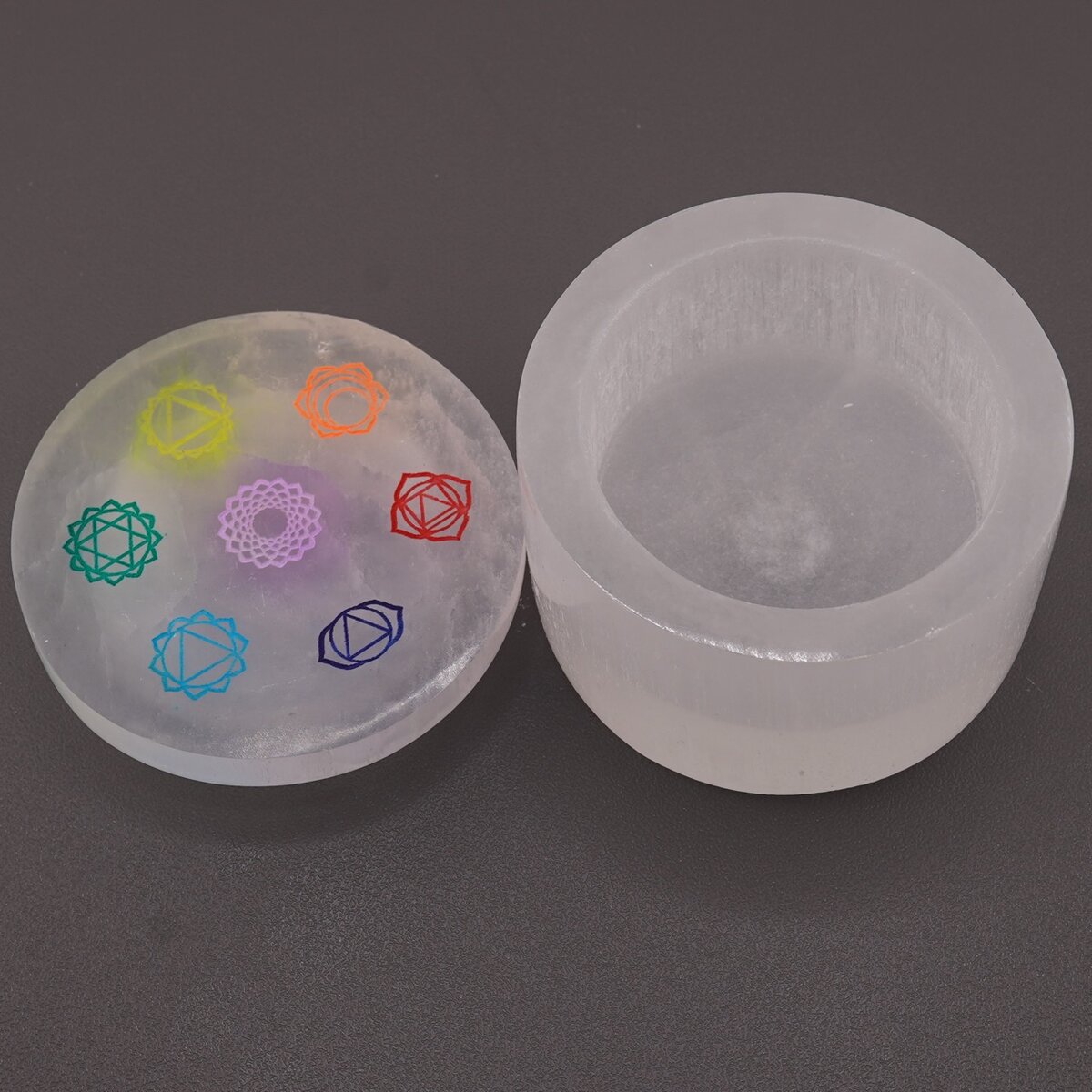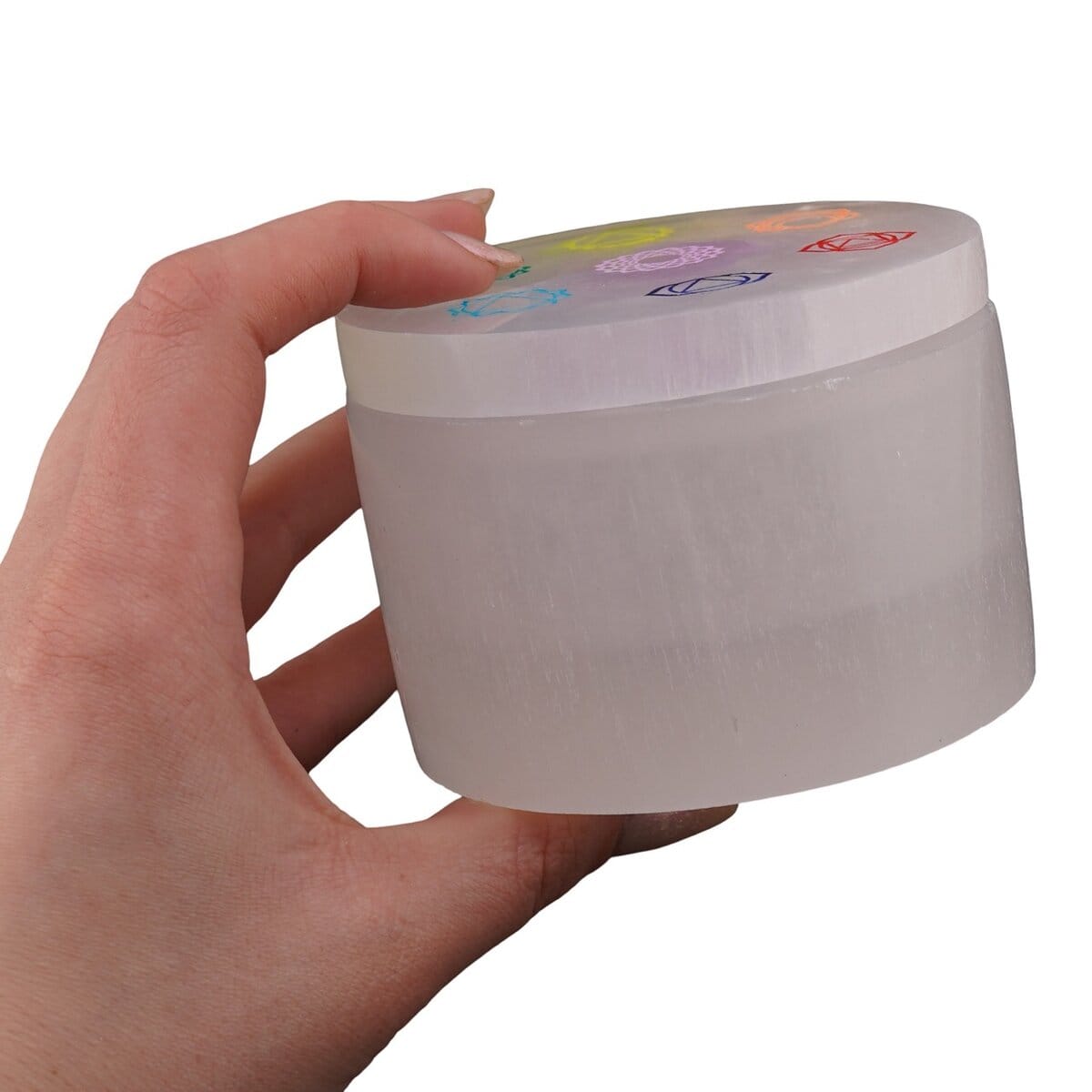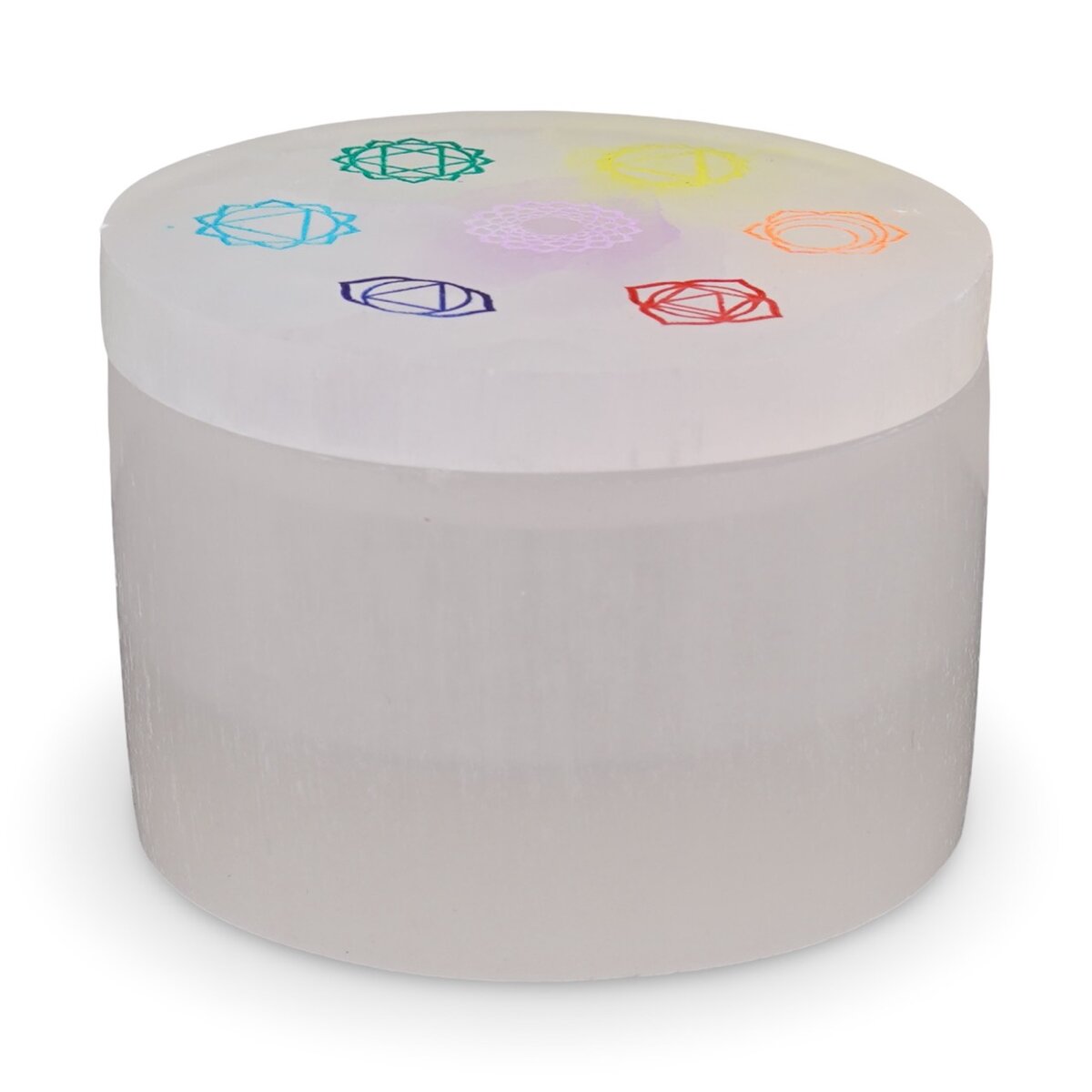 Cutie rotundă gravată cu cele șapte chakre din selenit, 8 cm