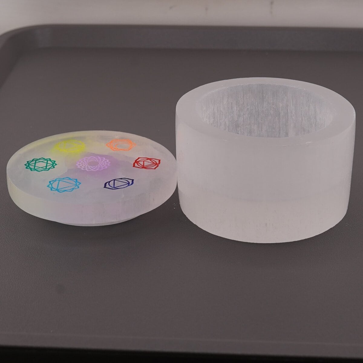 Selenitul este apreciat în lumea cristalelor pentru asocierea sa cu purificarea, claritatea și susținerea unui spațiu ordonat din punct de vedere emoțional și spiritual. În această formă de cutie cu capac, cristalul devine util nu doar ca obiect decorativ, ci și ca suport pentru cristale, bijuterii mici sau alte obiecte cu valoare simbolică. Gravura cu cele șapte chakre adaugă o semnificație aparte, fiind aleasă adesea de cei care folosesc simbolurile chakrelor în practici de reflecție, meditație sau echilibrare interioară.