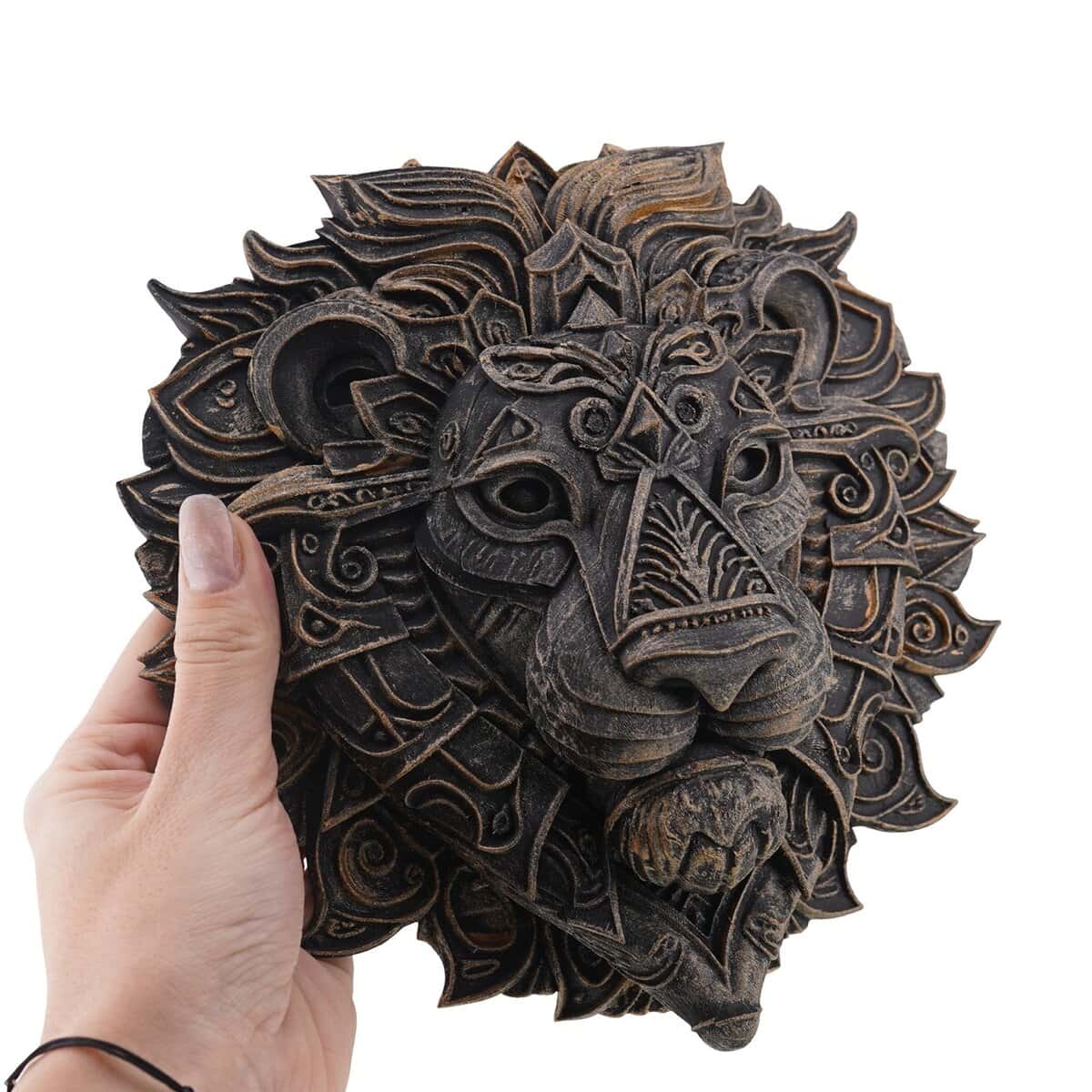 Piesa este realizată din PLA premium, un plastic rezistent, netoxic și considerat o opțiune mai prietenoasă cu mediul, modelat prin printare 3D de precizie. Astfel, forma capului de leu este bine conturată, iar fiecare linie tribală se vede clar. După modelare, decoratiunea este vopsită manual în stil antichizat, într-o combinație de auriu și negru care pune în valoare detaliile și oferă o notă discretă, dar expresivă. Fiecare piesă capătă astfel un aspect autentic, cu mici variații care îi dau caracter.