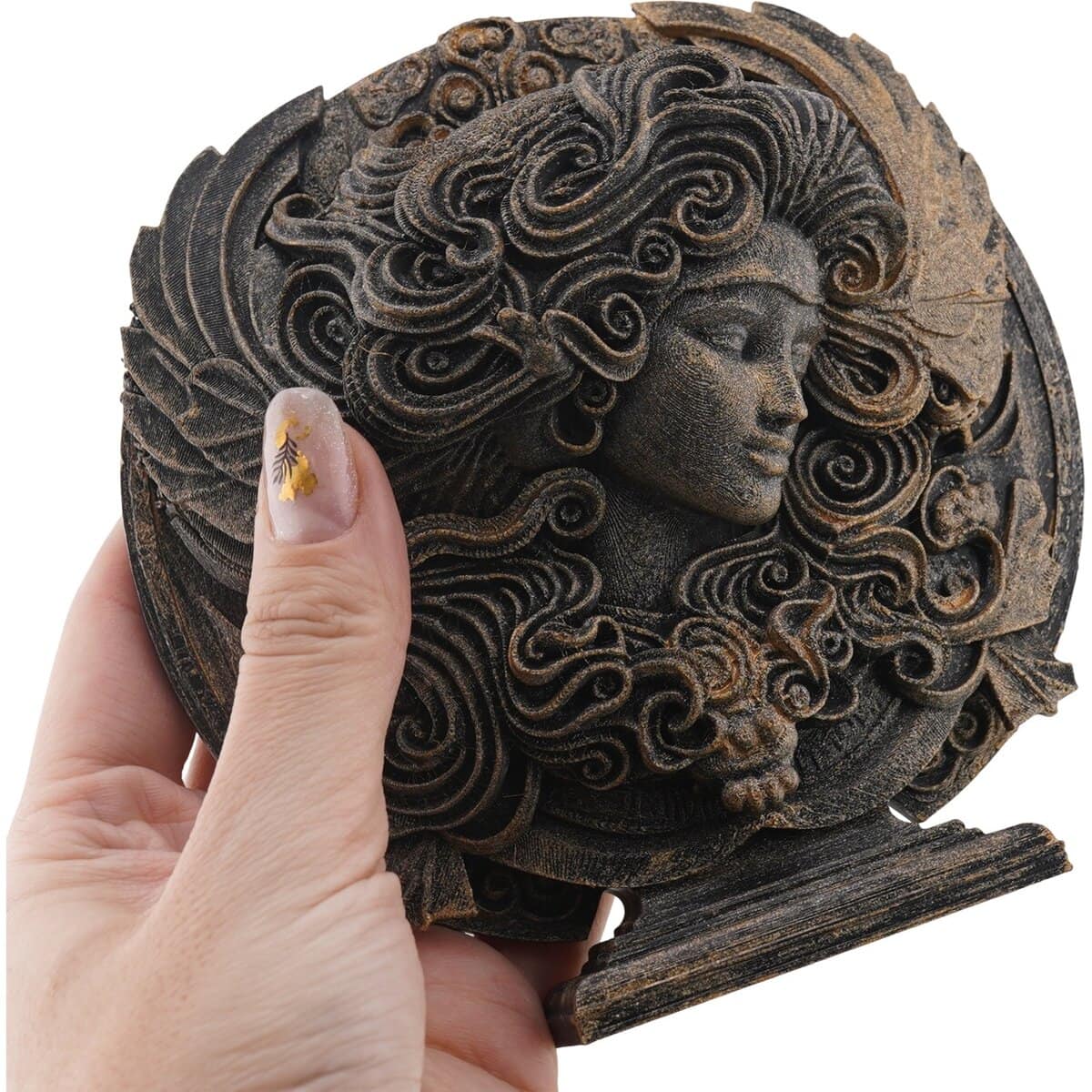 Decoratiunea este realizată din PLA premium, un plastic rezistent, netoxic și considerat mai prietenos cu mediul, folosit în printarea 3D de precizie. Acest material permite redarea clară a detaliilor în stil baroc, de la liniile fine ale chipului până la motivele decorative care încadrează simbolul zodiei Fecioara. Contrastul dintre negru și auriu pune în evidență aceste elemente, oferind un aspect clasic, potrivit atât pentru interioare moderne, cât și pentru spații amenajate în stil mai tradițional.