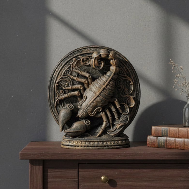 Simbolul scorpionului este gravat clar și este înconjurat de elemente decorative inspirate din stilul baroc, cu linii fine și detalii elegante care dau un aer clasic și rafinat. Contrastul dintre fundalul negru și accentele aurii creează o atmosferă caldă și plăcută, contribuind la o stare de echilibru și armonie în încăperea în care o așezi. Este o piesă potrivită pentru momentele în care ai nevoie de liniște, reflecție sau pur și simplu de o notă de calm vizual.