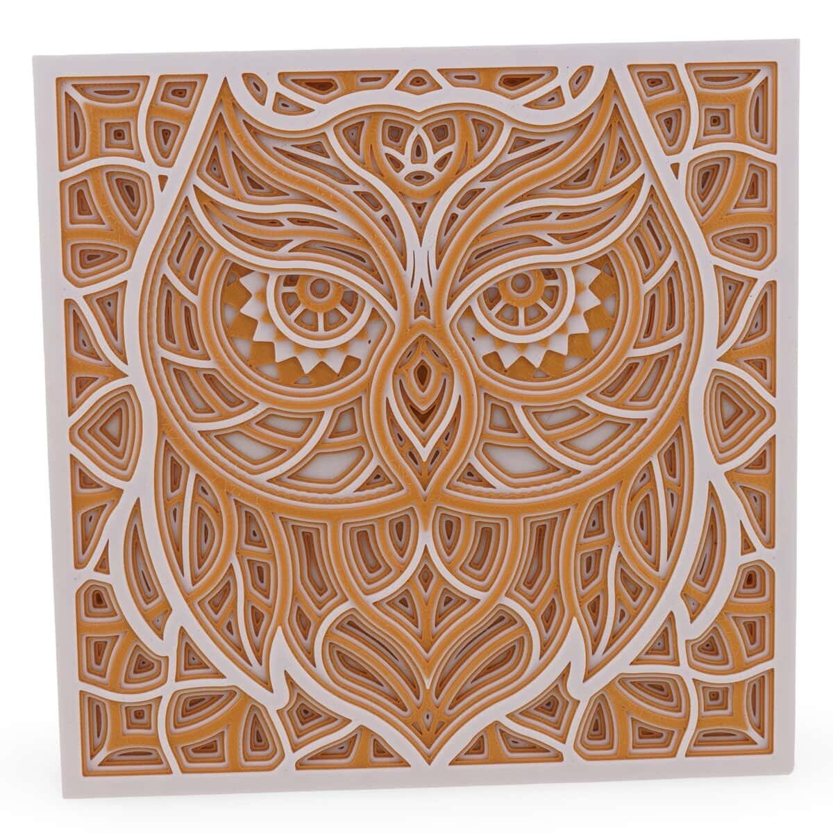 Imaginea alb-galben a bufnitei iese in evidenta pe fundalul simplu, ceea ce o face usor de integrat atat intr-un decor modern, cat si intr-un colt mai personal, cum ar fi biroul, dormitorul sau un mic spatiu de relaxare. Jocul de straturi adauga volum si dinamism, astfel incat decoratiunea nu pare plata, ci capata o prezenta discreta, dar interesanta pe perete sau pe o etajera.