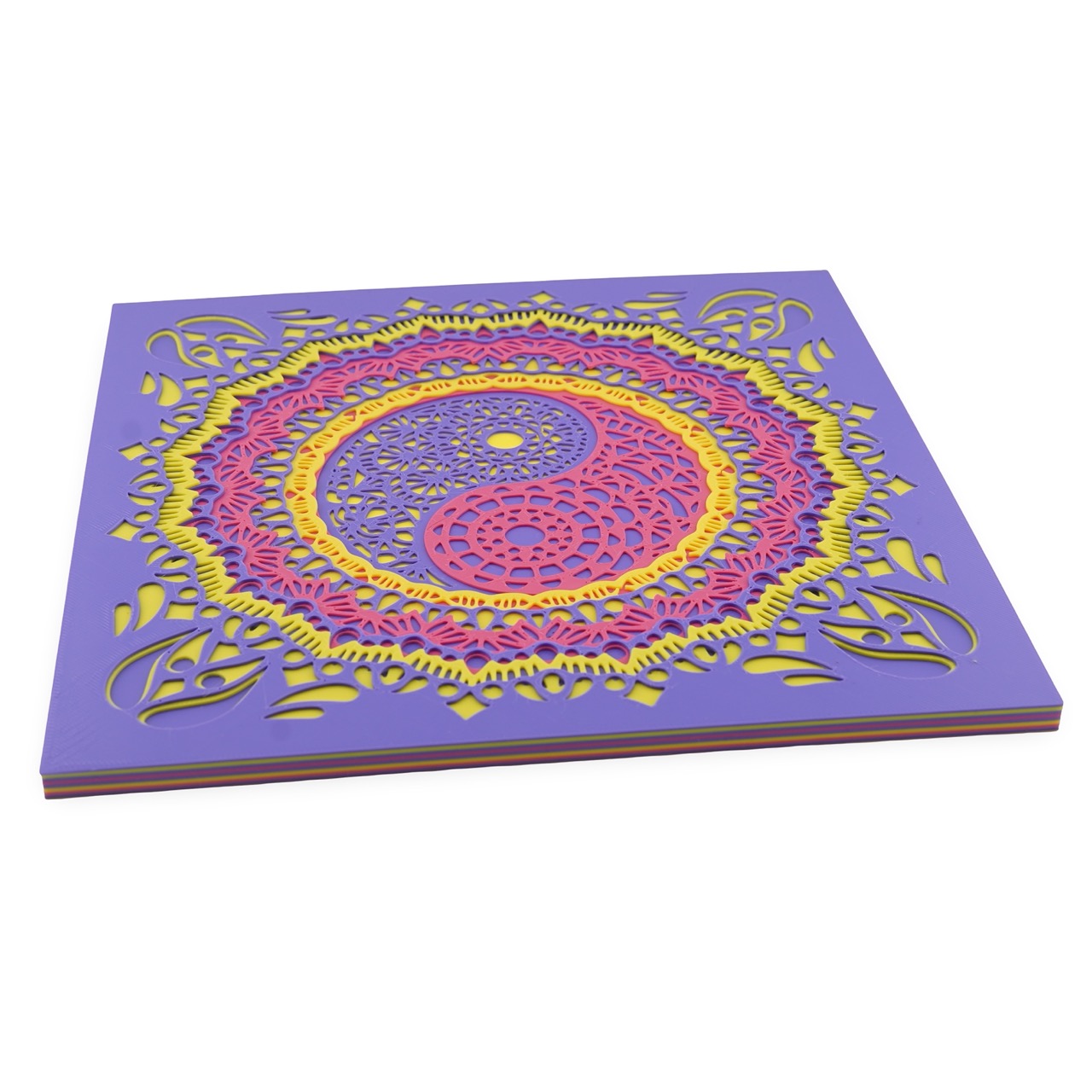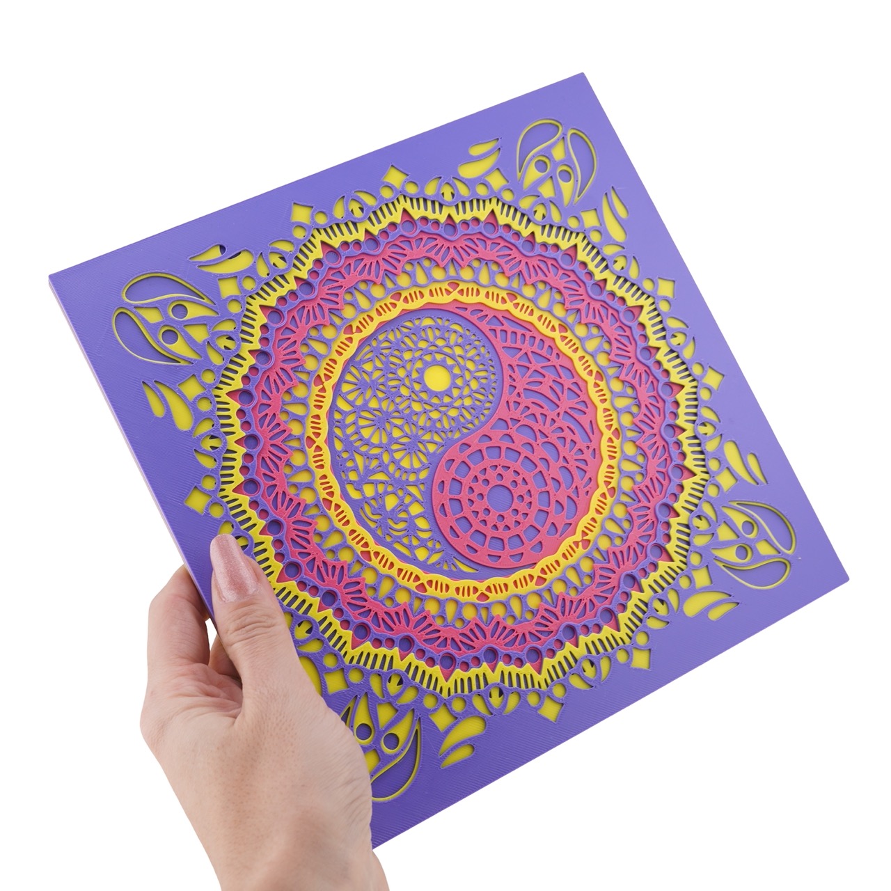 Decoratiunea este realizată din PLA premium, un plastic rezistent, netoxic și considerat o opțiune mai prietenoasă cu mediul. Materialul este obținut prin printare 3D de precizie, ceea ce permite definirea clară a liniilor mandalei și a conturului simbolului Yin Yang. Astfel, suprafața are o textură bine conturată, cu detalii care își păstrează forma în timp, chiar și atunci când este manevrată sau mutată dintr-un loc în altul.