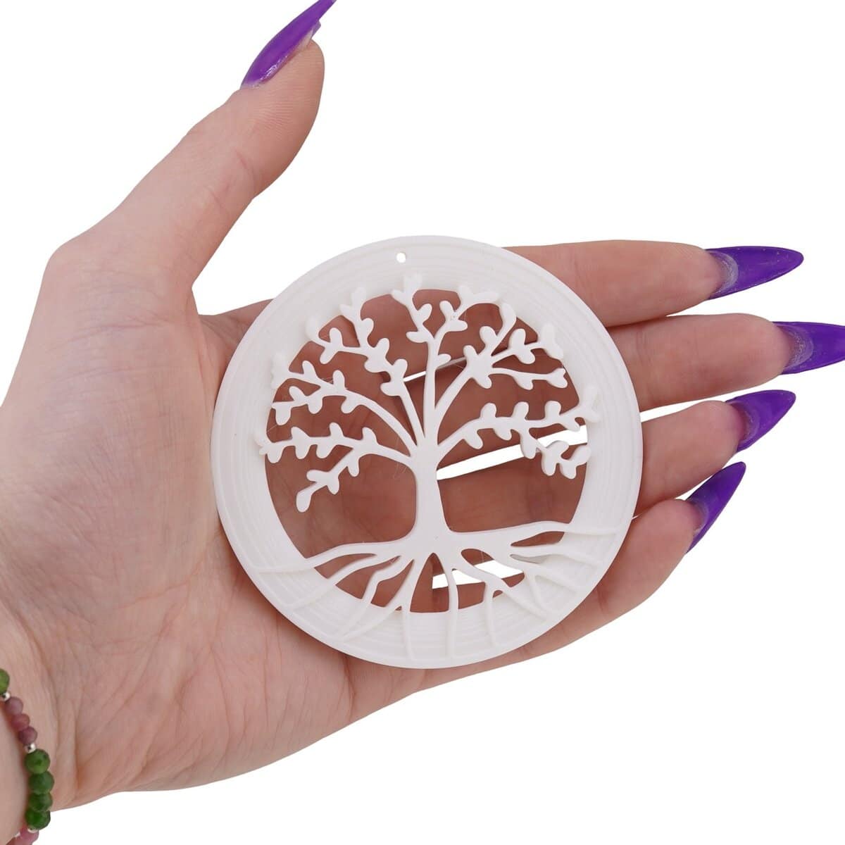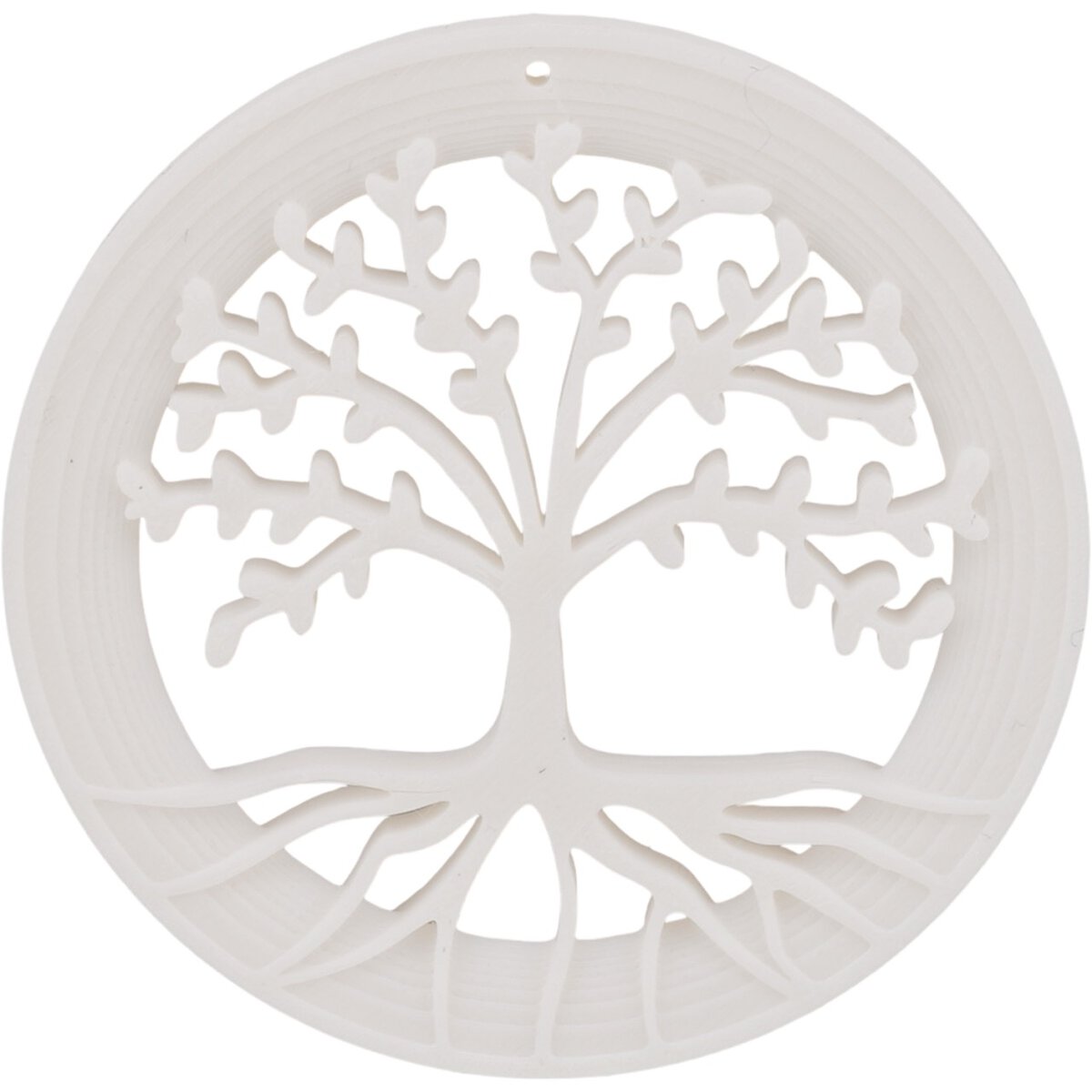 Decoratiunea rotunda Copacul Vietii, model perforat alb este un accent discret, creat pentru momentele în care îți dorești un plus de liniște și armonie în spațiul tău. Forma sa rotundă, cu un diametru de aproximativ 7,5 cm, pune în valoare simbolul Copacului Vietii, decupat fin, astfel încât lumina să poată trece ușor prin modelul perforat.
