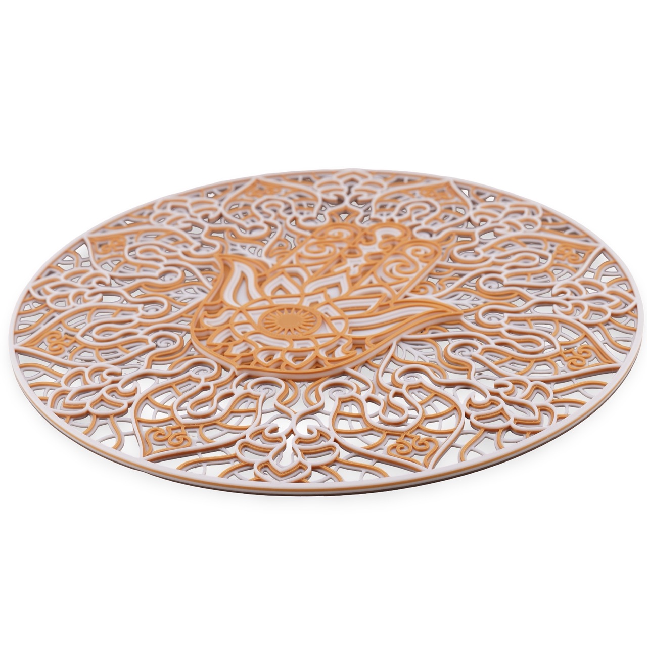 Decoratiunea rotunda layered mandala cu palma Hamsa, in nuante de alb si galben auriu, este gândită pentru tine dacă vrei să adaugi un accent decorativ armonios în spațiul tău. Designul său simetric atrage privirea prin detalii fine, iar contrastul dintre alb și tonurile aurii creează o atmosferă caldă și luminoasă în orice încăpere.