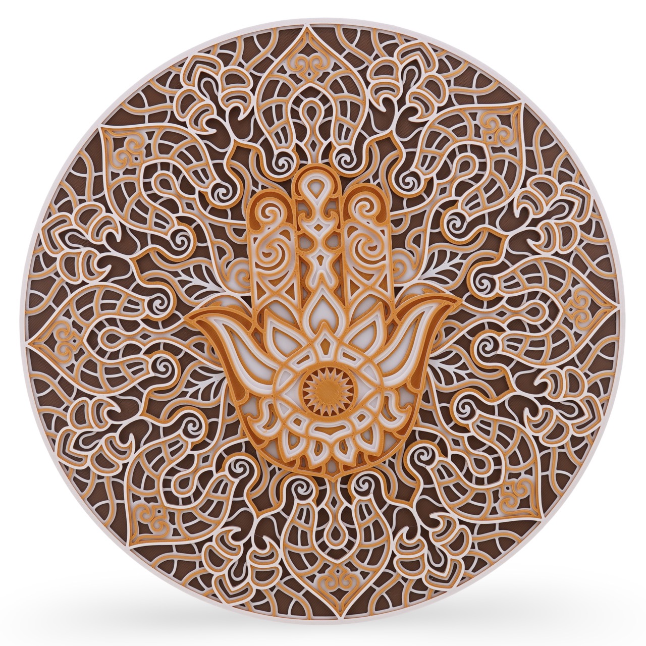 Piesa are forma clasică de Hamsa, integrată într-un disc rotund, cu un diametru de aproximativ 24 cm. Modelul de tip mandala se construiește în straturi, oferind profunzime și un efect vizual plăcut, ideal atunci când o așezi pe perete sau într-un colț special al casei. Fie că o poziționezi în zona de lucru, în dormitor sau în spațiul tău personal de relaxare, decoratiunea aduce un plus de echilibru vizual și rafinament.
