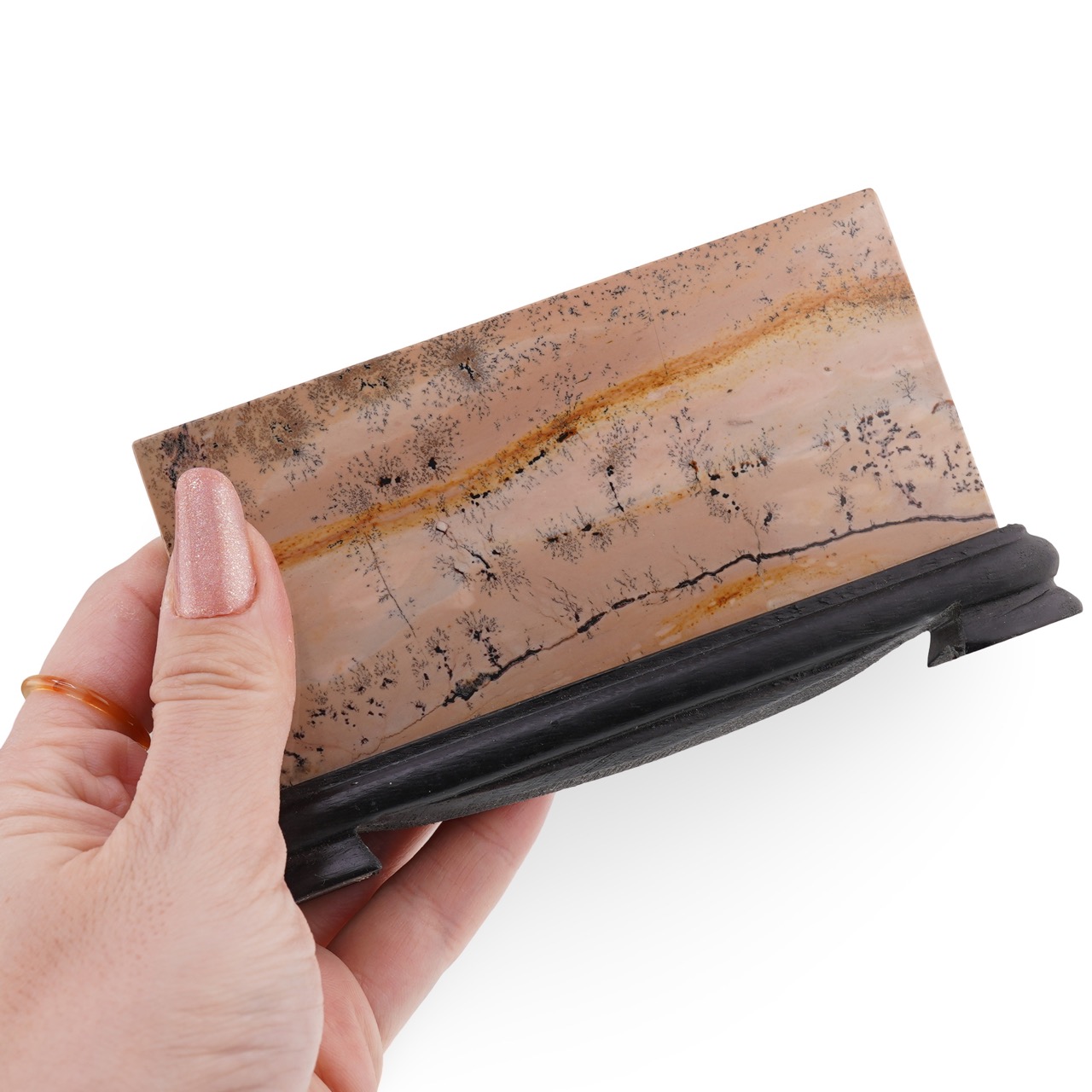 Această felie de Jasp Peisaj unicat, montată pe suport din lemn, este o piesă decorativă naturală care îmbină frumusețea pietrei semiprețioase cu un aspect cald și ușor de integrat în orice spațiu. Cu forma sa dreptunghiulară și nuanțe de maro și negru, fiecare detaliu al cristalului pune în valoare desenul natural specific jaspului peisaj, apreciat pentru aspectul său aparte și pentru simbolistica sa legată de stabilitate, protecție și bună așezare.
