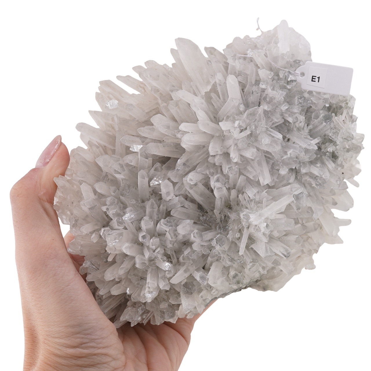 Exemplarul poartă codul E1 și se remarcă prin proporții echilibrate: aproximativ 15 cm x 11 cm și o greutate de 938 g, detalii ce îi oferă stabilitate pe un raft sau într-o vitrină. Nuanțele de cuart, de la translucid la lăptos, sunt puse în valoare de intercalările tipice florilor de mină, oferind profunzime și textură. Fiind realizat exclusiv din cristal natural, fiecare fațetă păstrează urme fine ale formării sale geologice, vizibile atunci când îl rotești în lumină.