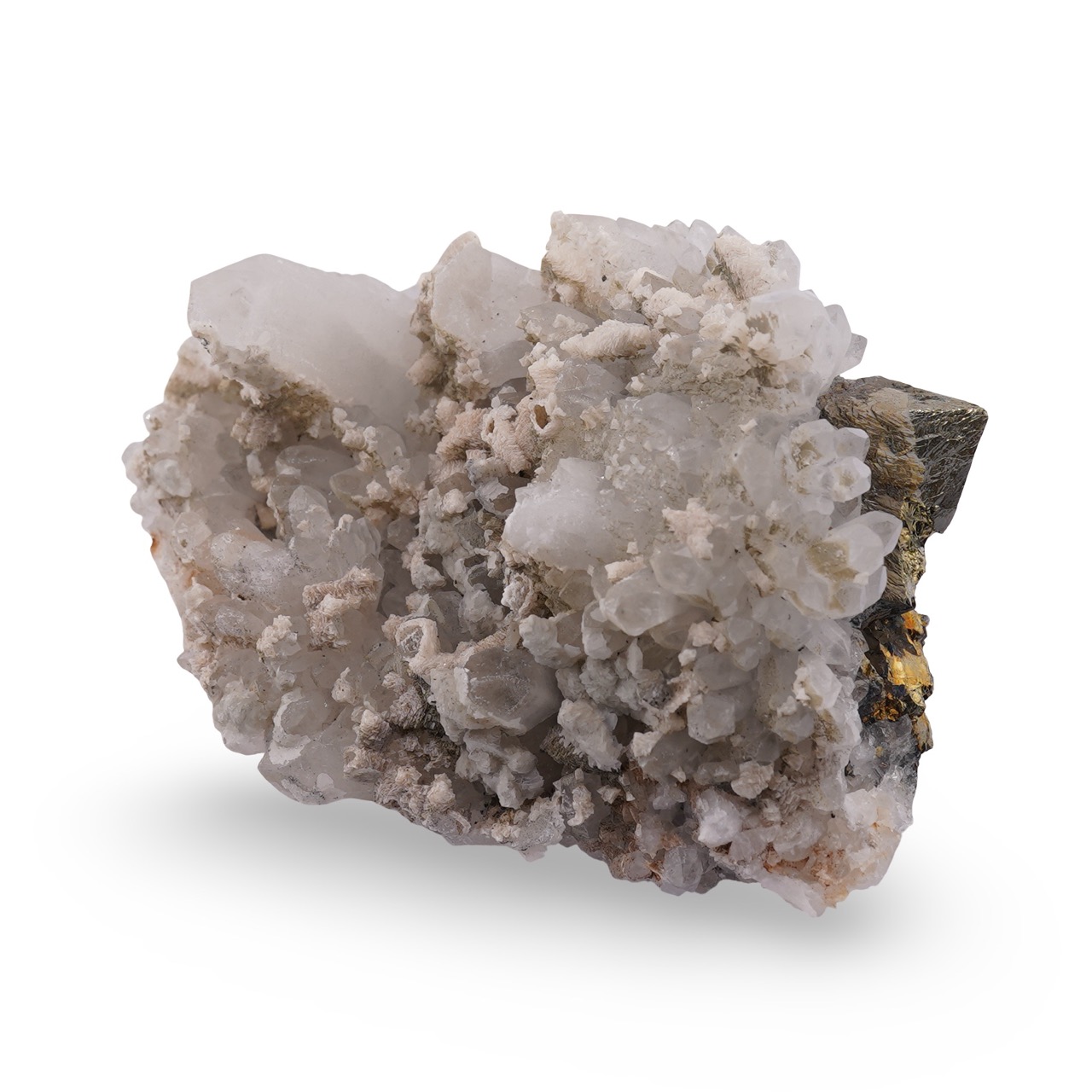 Floare de mină, cristal unicat, E116 deschide o fereastră către frumusețea geologică a Bulgariei. Structura sa specifică de floare de mină surprinde un dialog natural între cuart luminos, luciul metalic al piritei și reflexele calde ale calcopiritei. Împreună, aceste minerale conturează o compoziție care amintește de petalele unei flori, cu detalii ce atrag privirea din orice unghi.