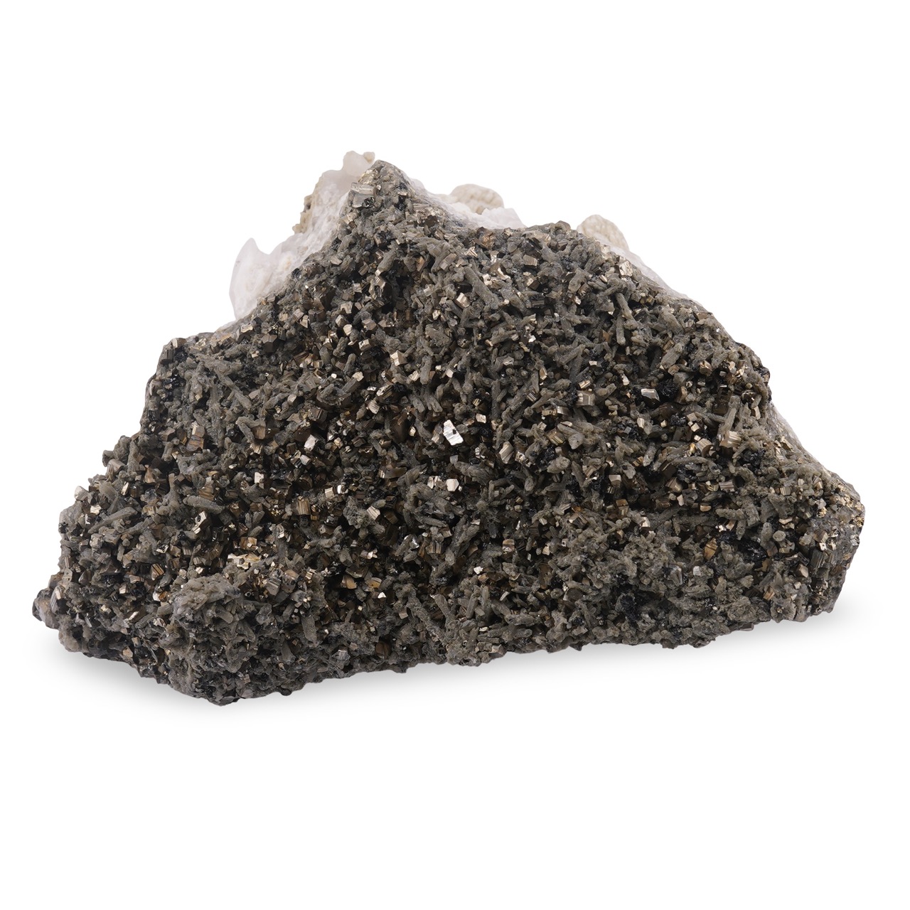 Compoziția sa reunește cuart, pirita și clorit, o combinație apreciată de iubitorii de pietre semiprețioase. Cuartul aduce claritate vizuală, pirita oferă un luciu metalic temperat, iar cloritul completează cu tonuri verzi naturale. Împreună, aceste minerale creează o piesă armonioasă, ușor de admirat din mai multe unghiuri, fie că o așezi pe un raft, pe birou sau într-o vitrină dedicată colecțiilor tale.
