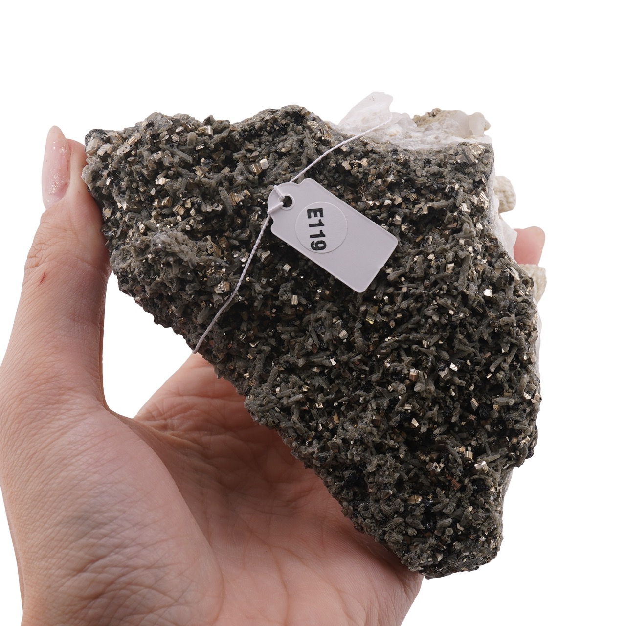 Fiind un cristal natural, păstrează nuanțele și inserțiile formate în timp, fără artificii. Pentru a-l menține în formă bună, curăță-l periodic de praf cu o pensulă moale și așază-l în lumină difuză, acolo unde strălucirea piritelor și transparența cuartului pot fi apreciate fără efort. Dacă ești pasionat de flori de mină din Bulgaria sau îți extinzi colecția de minerale, codul E119 îți oferă un reper clar pentru organizare.