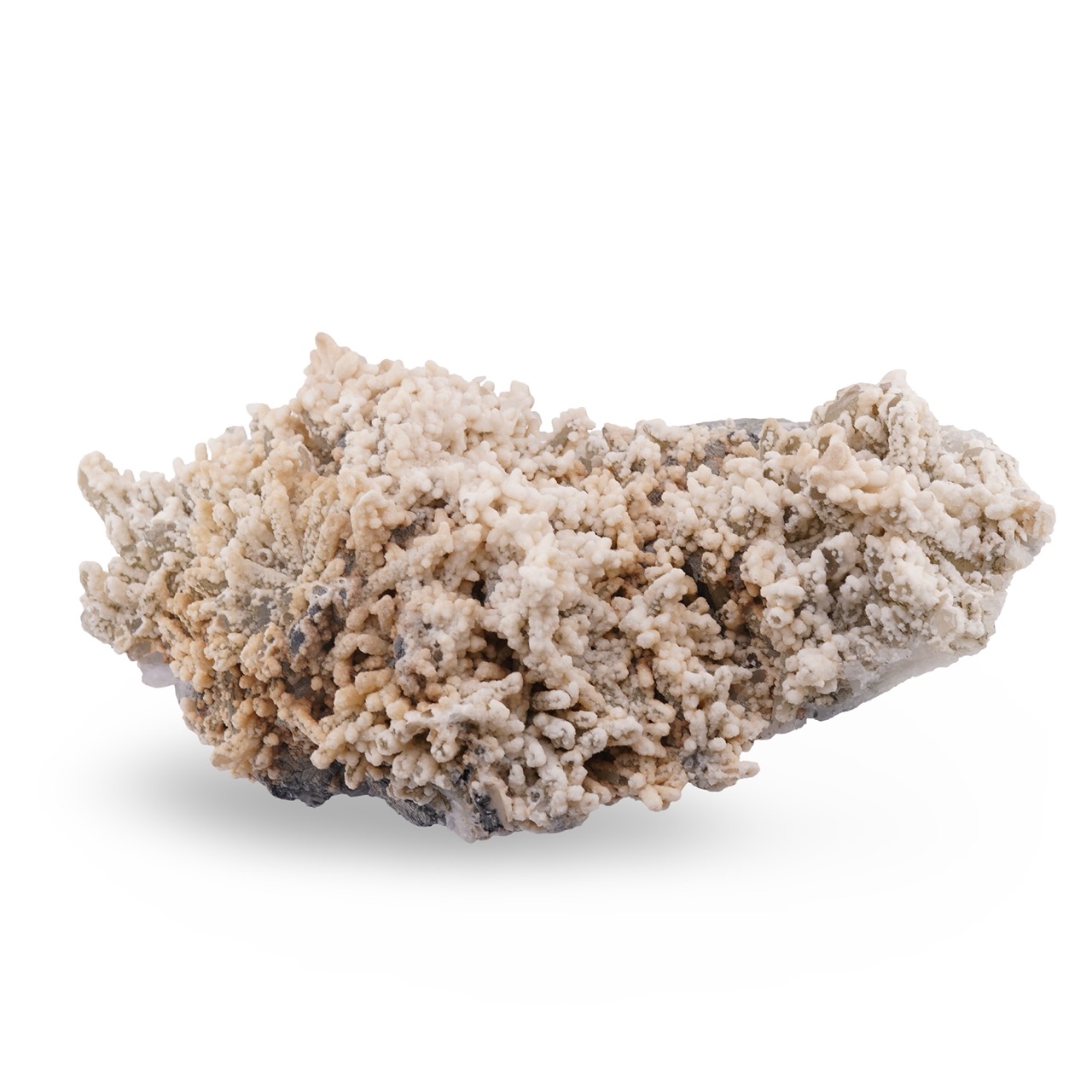 Structura sa minerală reunește armonios cuart cu transparențe fine, calcit poros cu un aspect cald, galena cu tonuri metalice, străluciri discrete de pirita și accente aparte de fluorină. Fiecare mineral adaugă profunzime vizuală: cuartul luminează ansamblul, calcitul poros aduce volum și textură, galena și pirita creează contraste elegante, iar fluorina introduce note de culoare ce prind viață la o lumină potrivită.