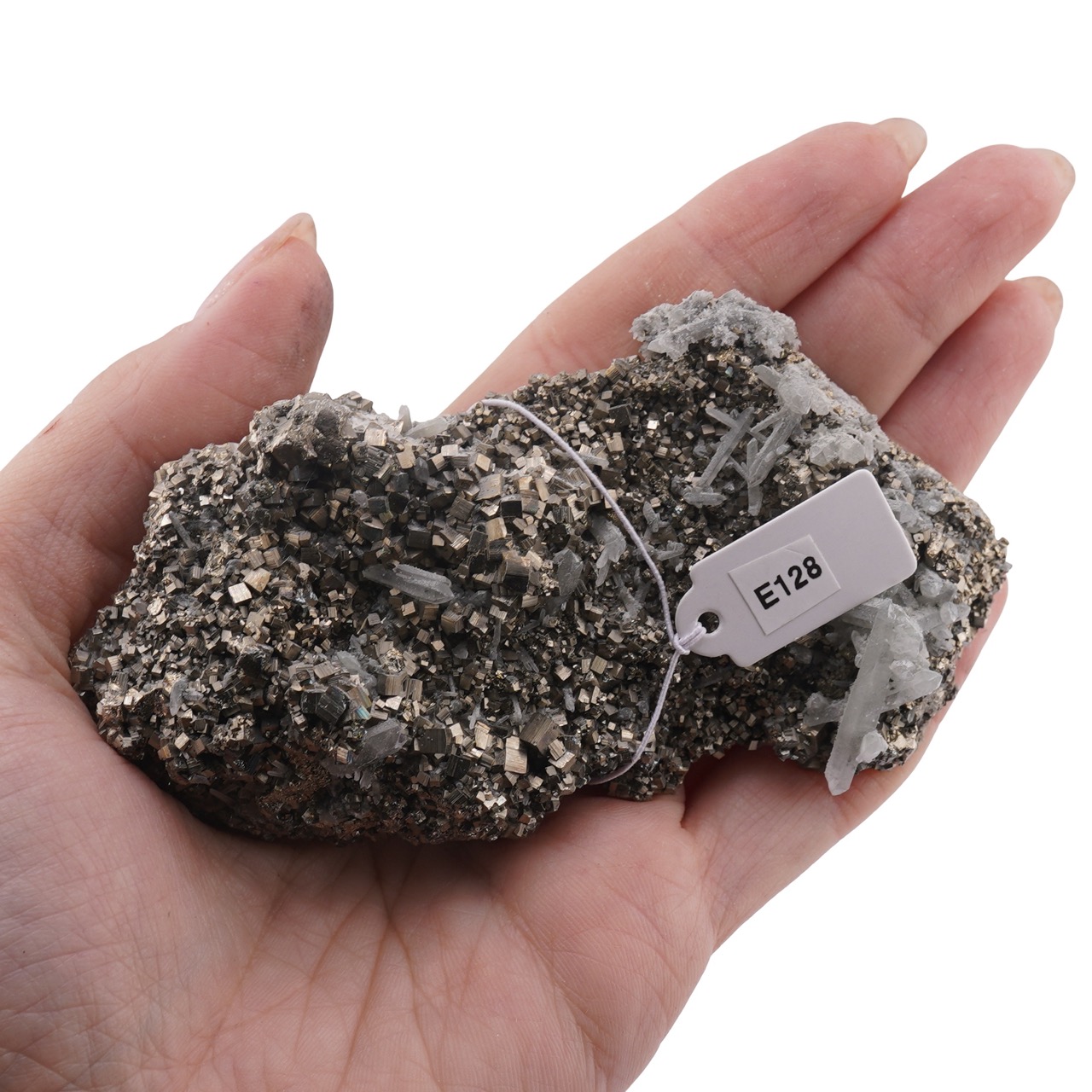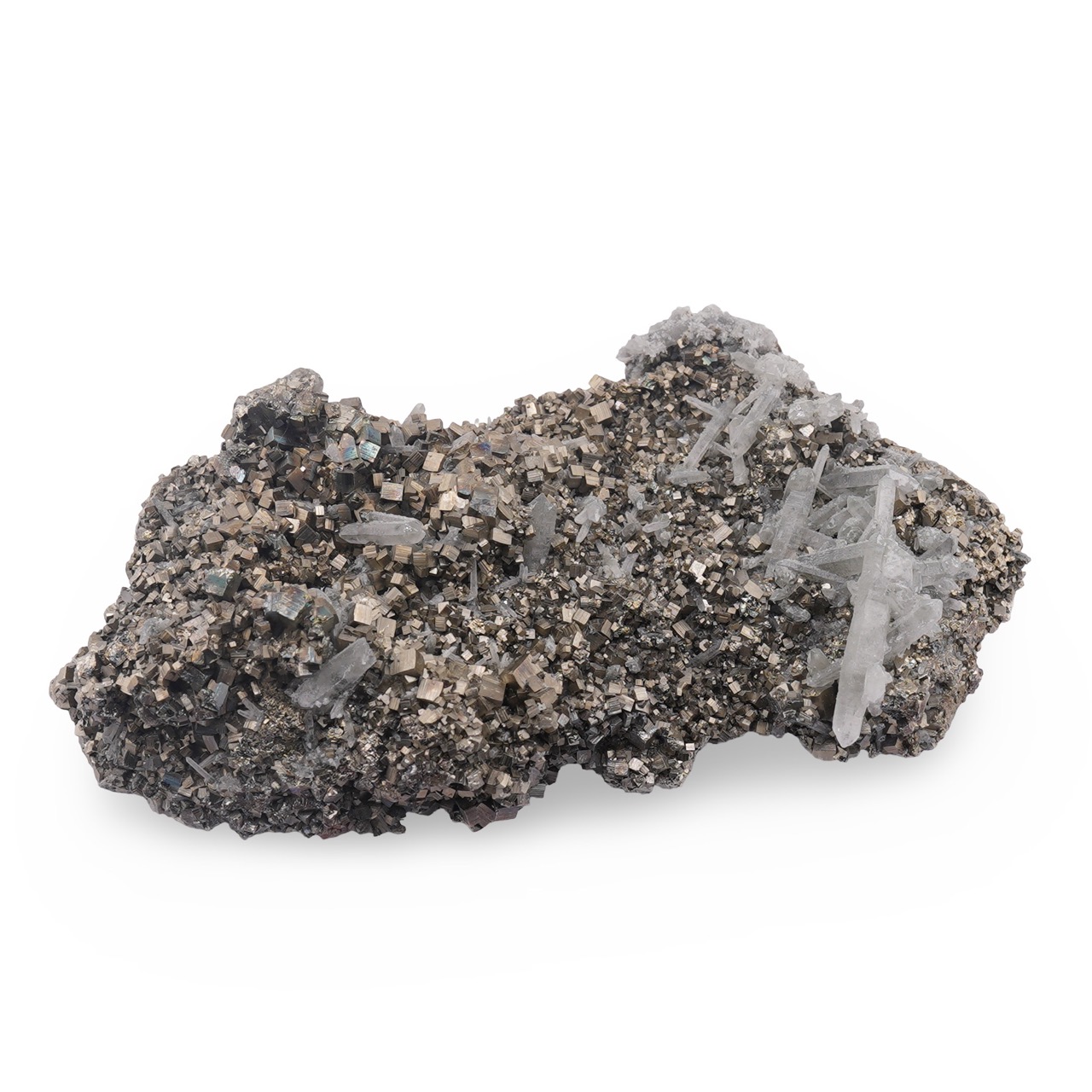 Structura sa combină energia metalică a piritei cu eleganța luminoasă a cuartului. Luciul cald al piritei contrastează plăcut cu claritatea discretă a cuartului, oferind un joc de lumini care se evidențiază frumos pe orice suport. Este piesa potrivită dacă îți dorești un accent mineral autentic, în care strălucirea naturală întâlnește liniștea formelor crescute în subteran.