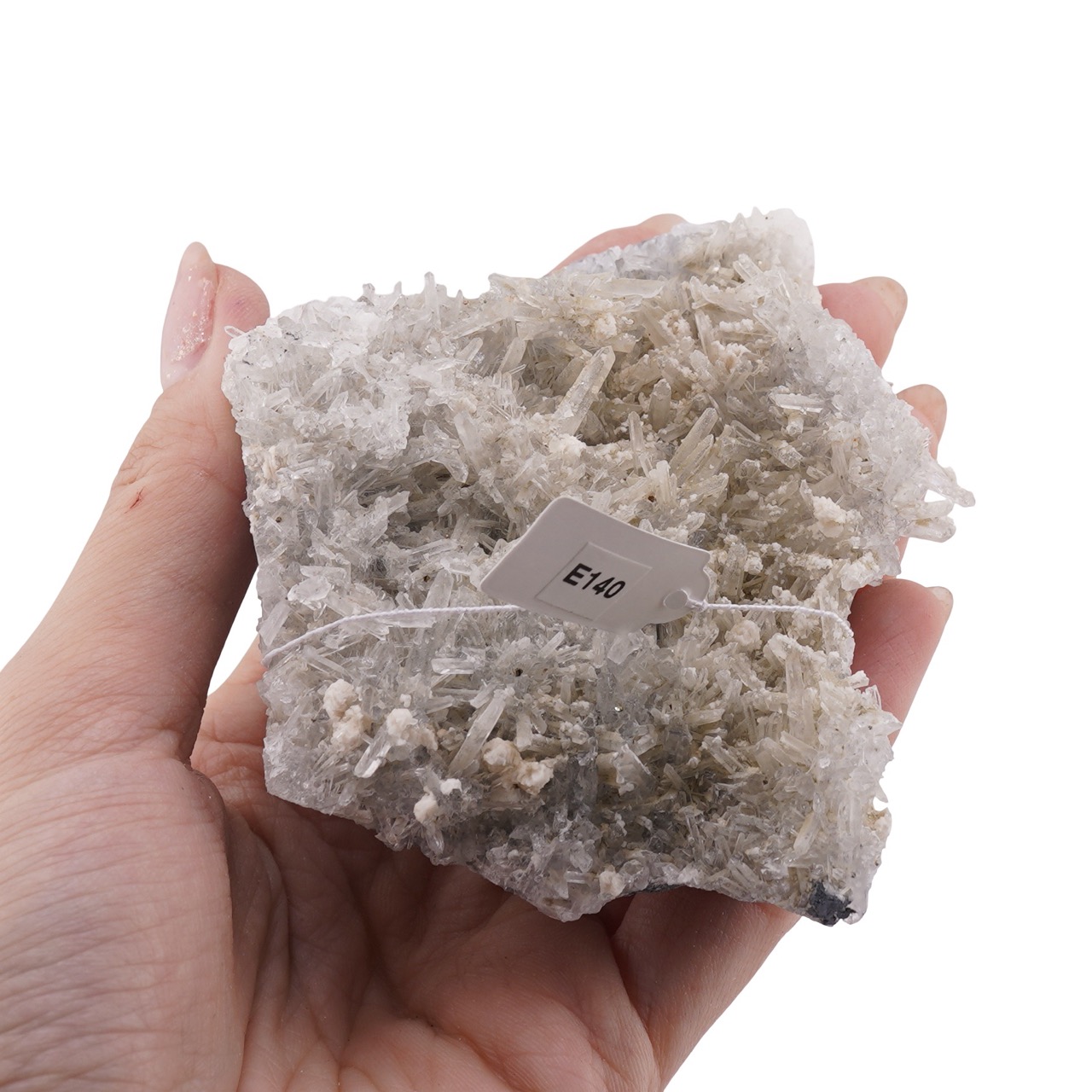Floarea de mină E140 poate deveni piesa centrală într-o colecție de pietre semiprețioase, dar se potrivește și ca obiect decorativ care aduce un accent natural într-un colț de lucru sau într-un spațiu de relaxare. Prezența cuartului sugerează transparențe plăcute, iar cloritul completează ansamblul cu note pământii, oferind un echilibru vizual discret.