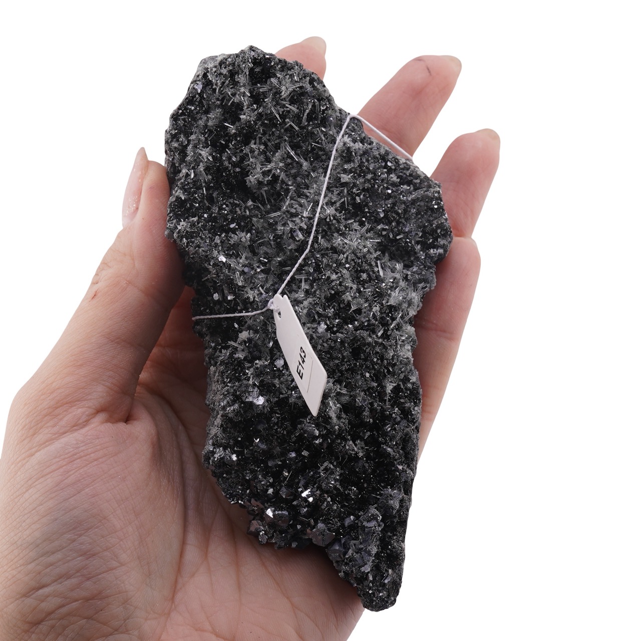 Dacă îți place să pui în valoare fiecare detaliu, așază piesa aproape de o sursă de lumină caldă. Cuartul va capta străluciri fine, în timp ce galena va reflecta subtil, creând un efect vizual plăcut. E143 se integrează ușor printre alte pietre semiprețioase sau poate deveni piesa centrală a unei etajere minimaliste. Pentru întreținere, șterge ușor praful cu o pensulă moale și evită umezeala excesivă sau substanțele chimice, pentru a păstra aspectul natural al sfaleritului și al cuartului.