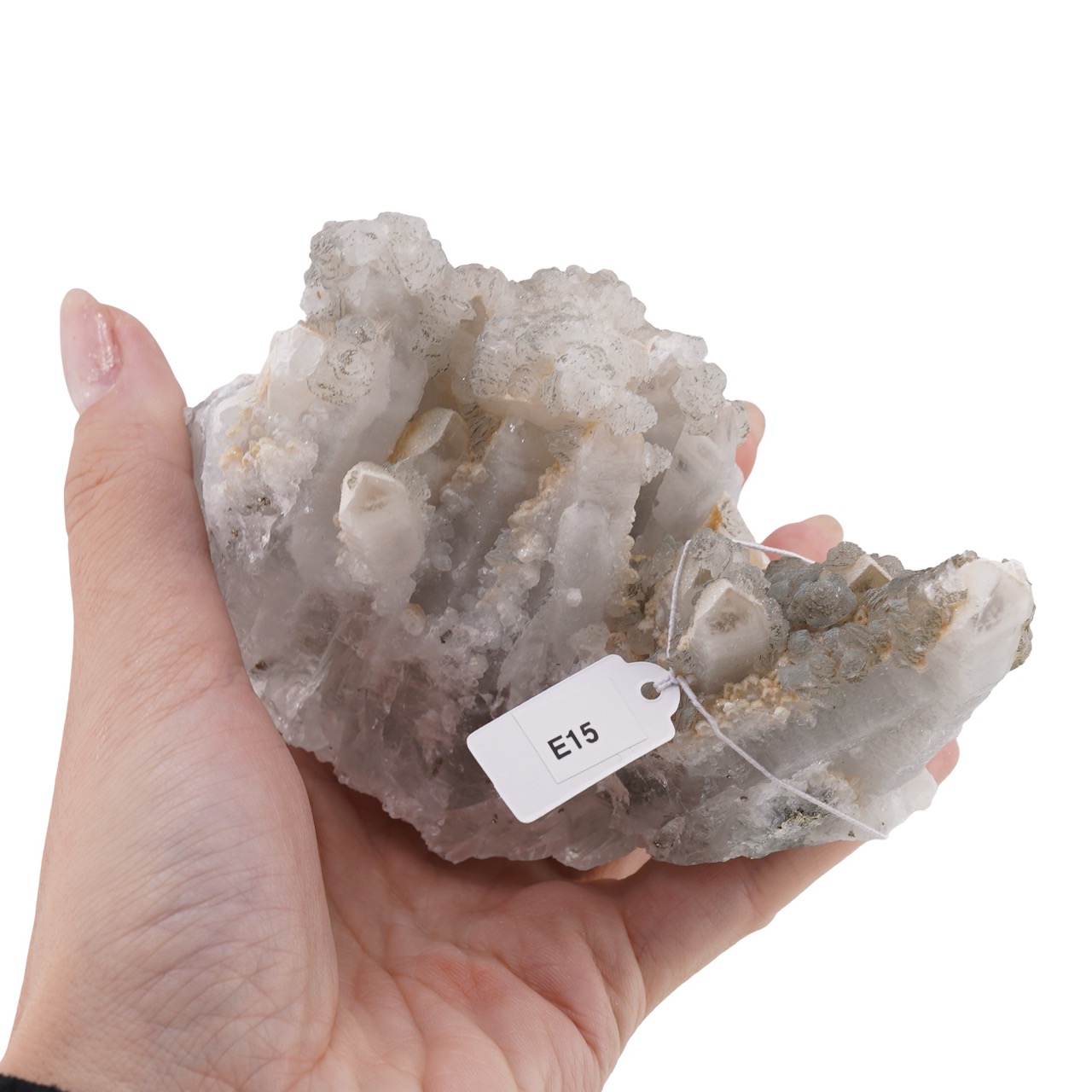 Cu dimensiuni de aproximativ 9 cm x 5 cm și o greutate în jur de 482 g, E15 are o prezență compactă, stabilă, potrivită pentru o vitrină, un colț de bibliotecă sau birou. Suprafața oferă detalii fine pentru privit îndeaproape, dar și un aspect coerent de la distanță, ceea ce îl face o alegere plăcută atât pentru colecționari, cât și pentru cei care își doresc un accent mineral în spațiul personal.