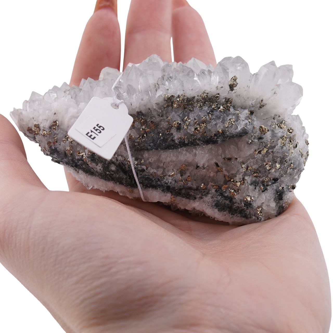 Structura este 100% cristal natural, cu un nucleu de cuarț ce susține inserții de pirită. Cuarțul oferă o claritate sticloasă și detalii subtile, în timp ce pirita adaugă mici reflexe metalice, ușor aurii, care prind viață la lumină. Îmbinarea acestor minerale creează un contrast plăcut între luciul fin și irizațiile calde, tipice unei flori de mină bine formate.