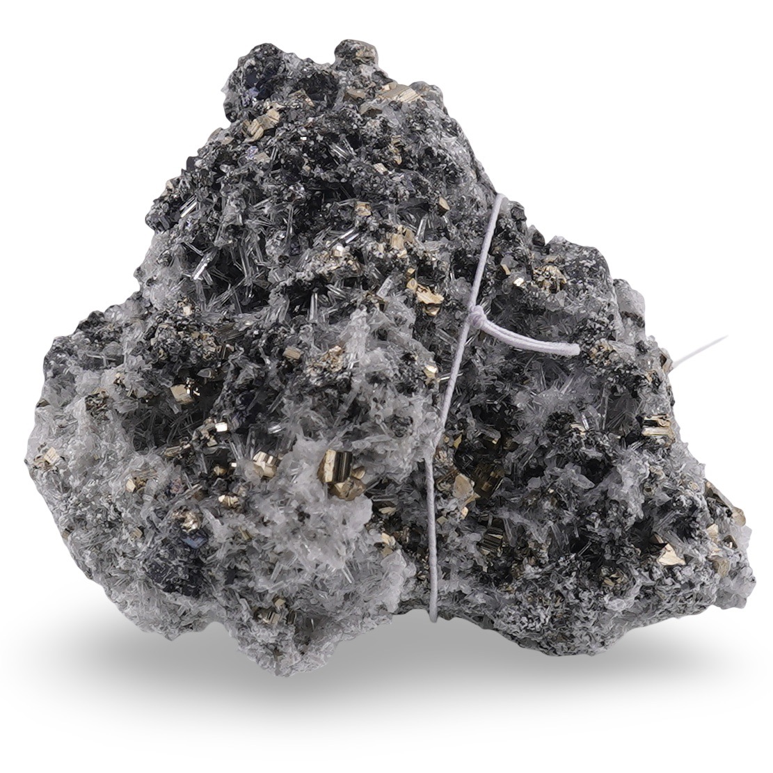 Această floare de mină din Bulgaria este un cristal de colecție care surprinde prin felul în care natura a combinat cuarțul, pirita, sfaleritul și cloritul într-o structură armonioasă. Piesa este 100% naturală și poartă codul E165, fiind ușor de identificat în colecția ta. Texturile se completează elegant: luciul metalic al piritei contrastează cu transparențele delicate ale cuarțului, iar nuanțele închise ale sfaleritului și accentele verzi de clorit adaugă profunzime vizuală.