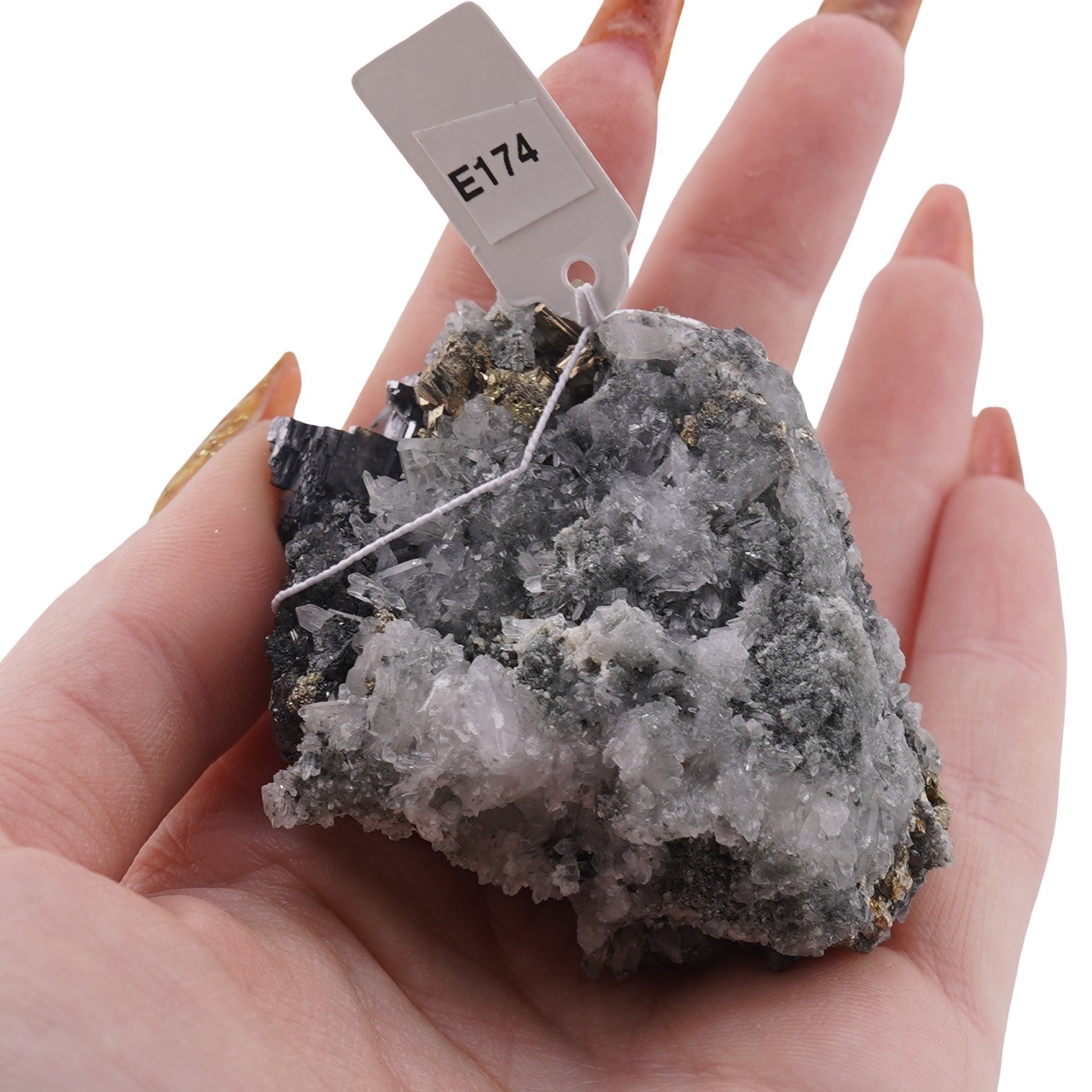 Dacă îți dorești un specimen autentic din Bulgaria, cuart împletit cu sfalerit, pirită și clorit într-o formă de floare de mină, E174 este o alegere inspirată. Lasă-l să aducă un strop de natură pe masa ta de lucru sau în vitrina ta, ca o invitație zilnică la observare atentă și aprecierea frumosului din mineralogie.