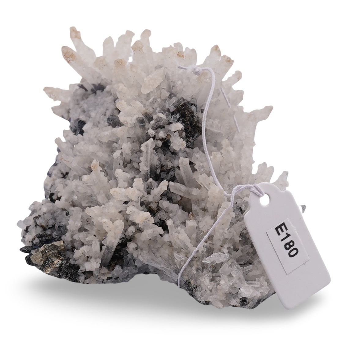 E180 este o floare de mină care pune în valoare contrastul dintre strălucirea discretă a mineralelor și liniștea texturilor naturale. Provenită din Bulgaria, piesa reunește într-o compoziție armonioasă cuarțul clar, reflexele închise ale sfaleritului, nuanțele metalice ale galenei și sclipirile calde ale piritei. Rezultă un specimen atrăgător, potrivit pentru colecționari și pentru oricine apreciază frumusețea brută a rocilor.