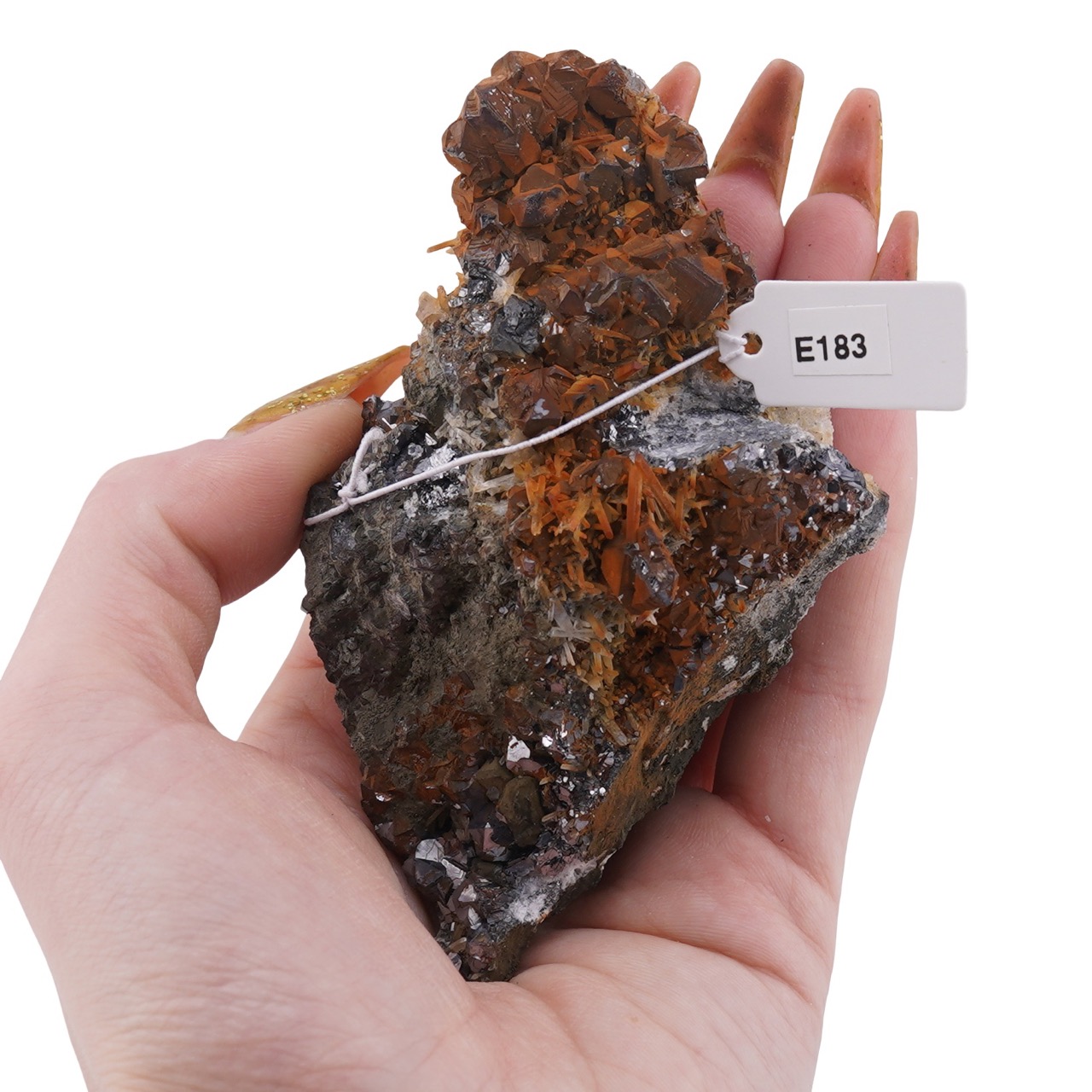 Descoperă farmecul unei flori de mină formate în mod natural în subsolurile Bulgariei. E183 este un cristal de colecție creat exclusiv de natură, 100% cristal natural, în care se întâlnesc într-o matrice de rocă nuanțele reci ale galenei, accentele verzi de clorit și tonurile calde de limonit. Texturile se completează armonios, oferind un joc de reflexii metalice și pete de culoare ce atrag privirea fără a încărca vizual spațiul.
