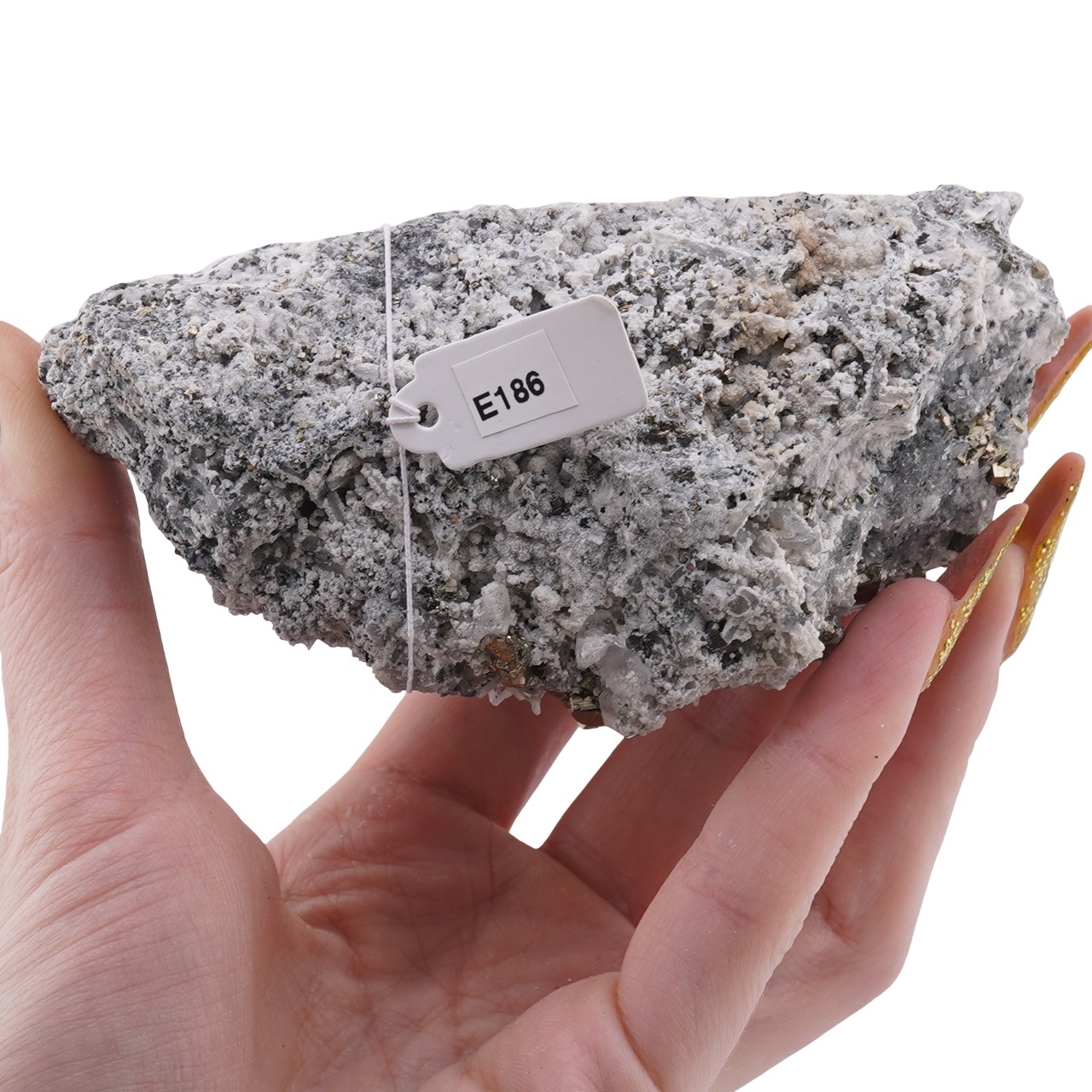 Îl poți așeza pe un suport simplu sau direct pe o poliță, preferabil în apropierea unei surse de lumină naturală, pentru a evidenția reflexiile metalice. Pentru îngrijire, îndepărtează ușor praful cu o pensulă moale sau cu aer la rece și evită contactul prelungit cu umezeala, deoarece calcitul poros este mai sensibil. Marcajul E186 îți face mai facilă organizarea și identificarea în colecție.