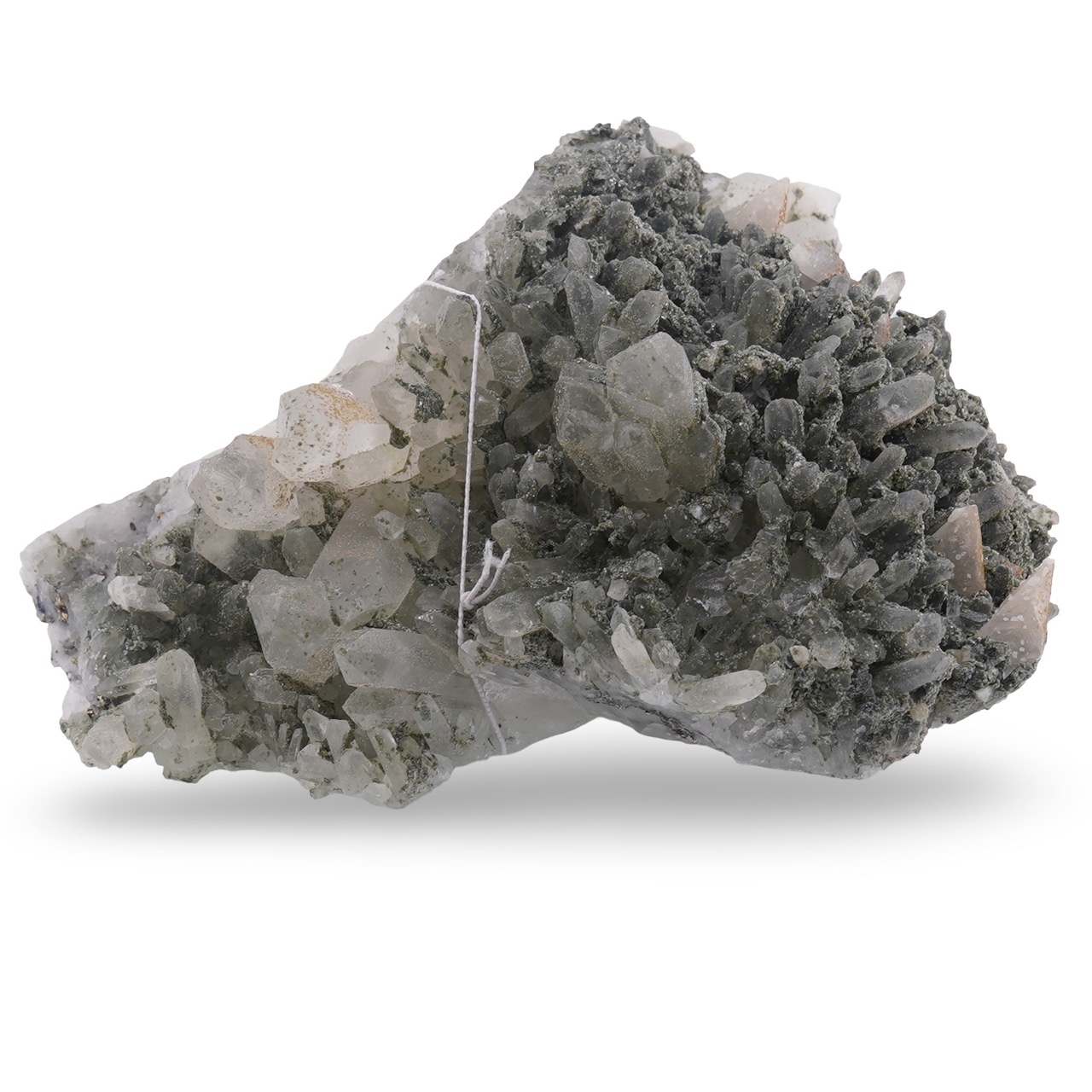 Structura sa reunește cuart, pirita și clorit. Cuartul aduce claritate și transparență, pirita oferă reflexe metalice ușor aurii, iar cloritul lasă un accent verde discret, ca o patină minerală. Împreună, aceste minerale creează un joc de culori și luciu care se schimbă subtil în funcție de lumină, ceea ce face ca fiecare privire să descopere un detaliu nou.